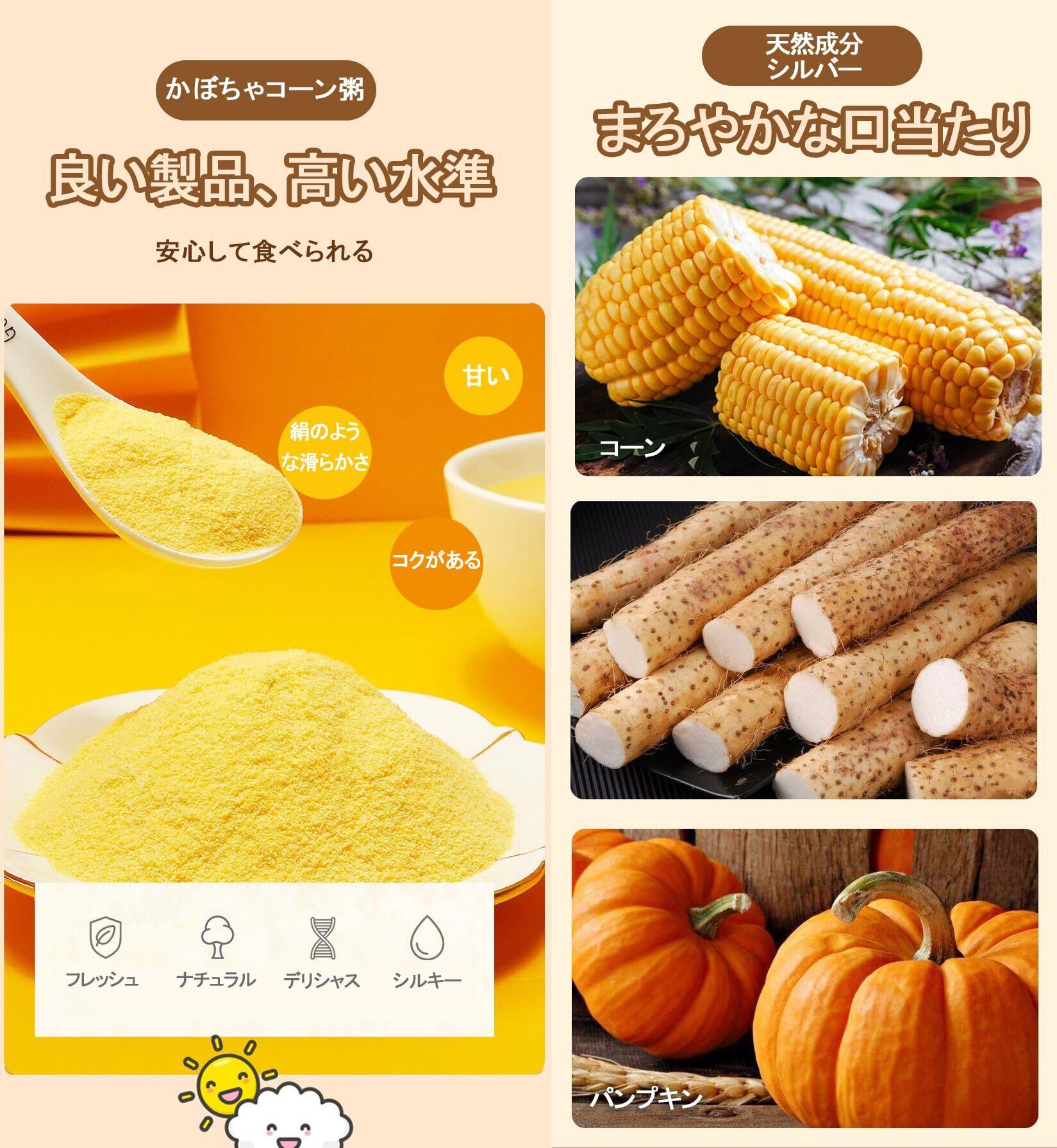 【着色料無添加】添加物を一切使用していないため、かぼちゃコーン粥は自然食品と言えます。着色料、保存料、砂糖を一切使用していないため、甘さは素材そのものの自然な甘さです。お好みに応じて、牛乳、豆乳、蜂蜜などを加えてもよい。