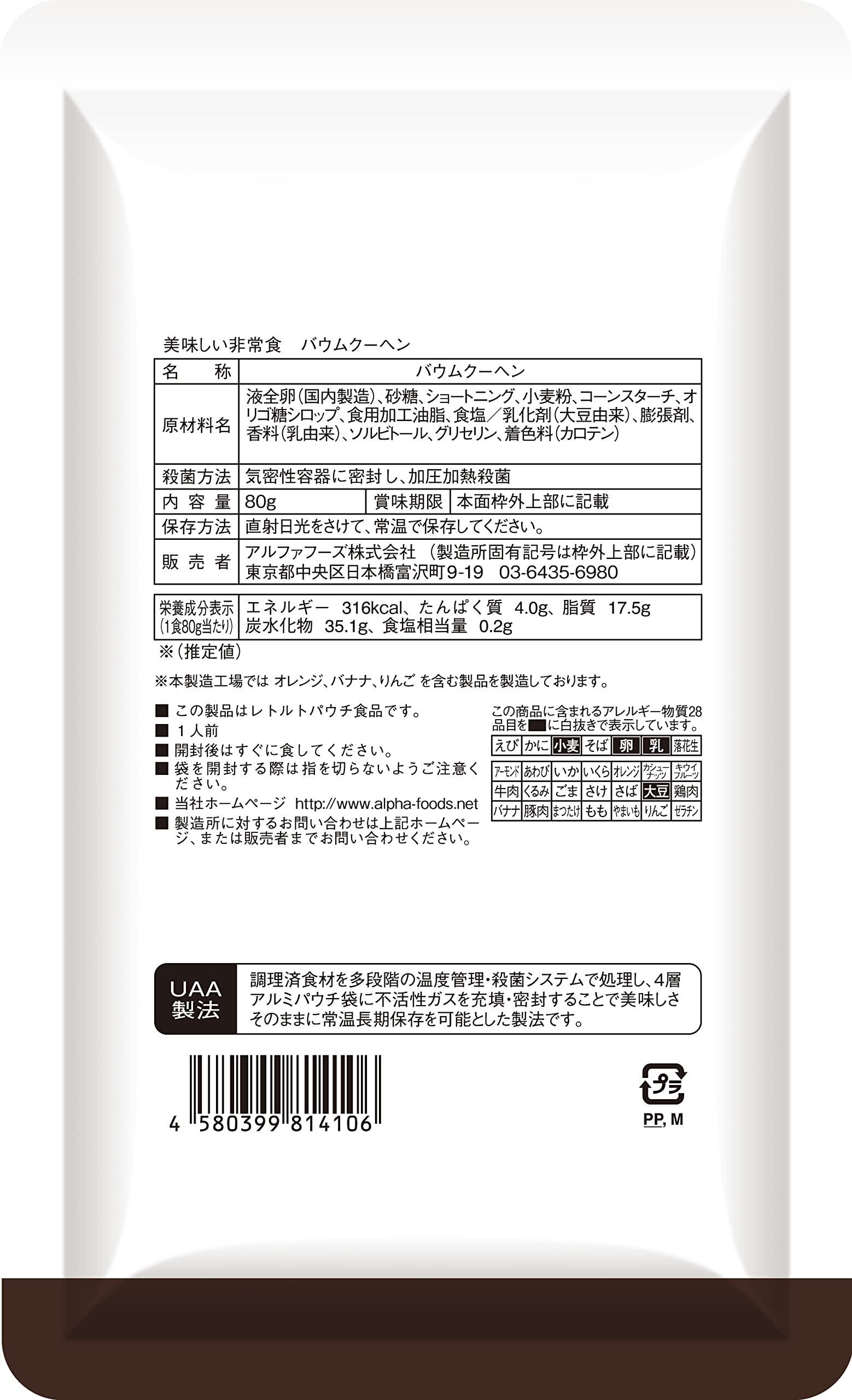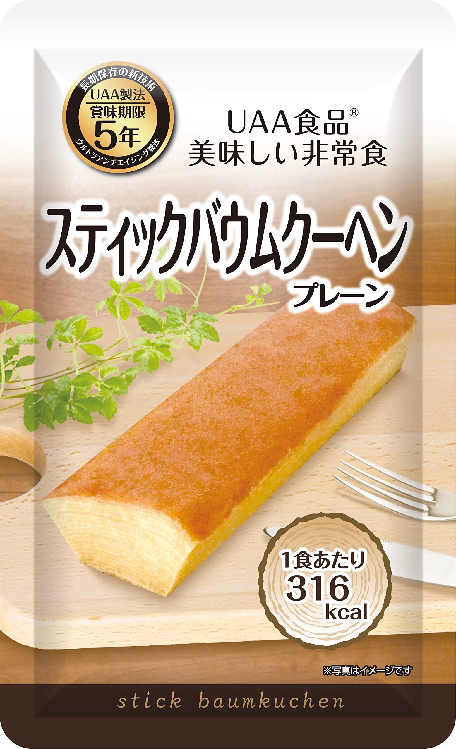 【UAA食品®美味しい非常食】 ・手軽に美味しくエネルギー補給 ・常温のまま、温めずすぐに食べれる。 ・レトルト臭がほとんどなく、出来立てに近い美味しさ。 ・常温で5年7カ月の長期保存。 ・しっとりくちどけの良いスティックタイプのバウムクーヘン 【UAA(ウルトラアンチエイジング)製法とは?】 原材料を下処理・前処理後、調理した食材を酸素と光を遮断するバリヤー性のある4層アルミパウチ袋に入れ、 一旦空気を排出し、新たに不活性ガスを充填して密封し、コンピューター制御による多段階の昇温・降温殺菌 システムで長期保存を可能とした製法。これらの行程により、食品の酸化、劣化を抑える事で、保存料などを 添加することなく、常温長期保存を可能にしています。