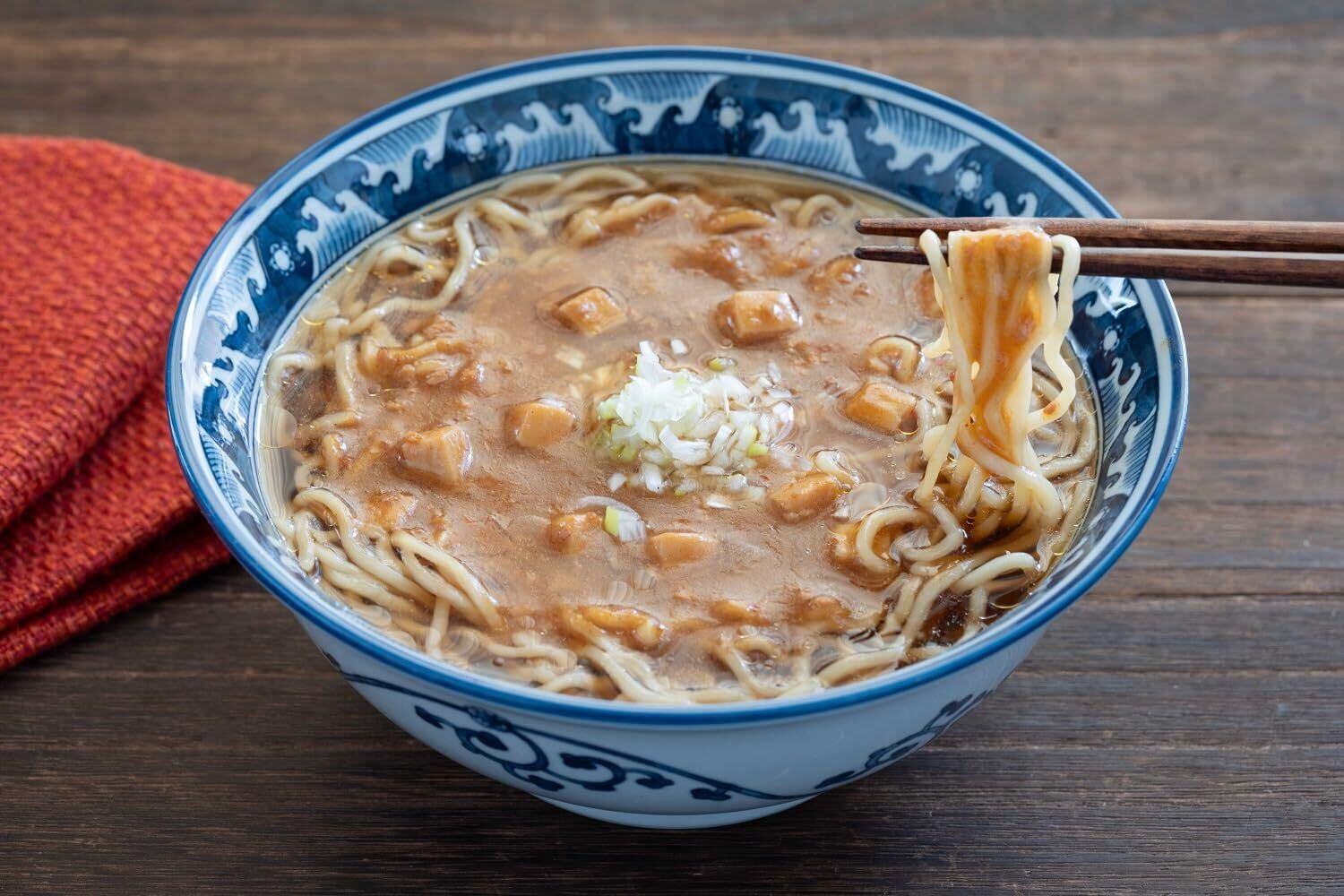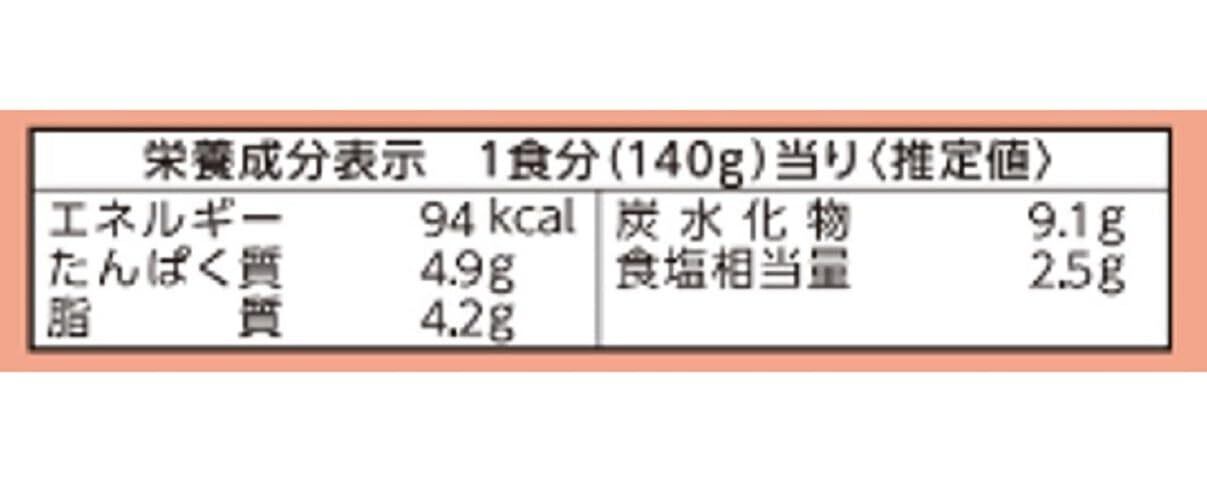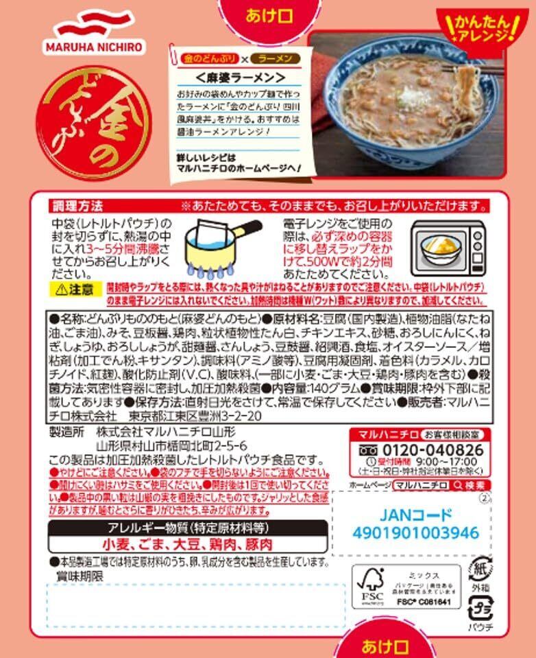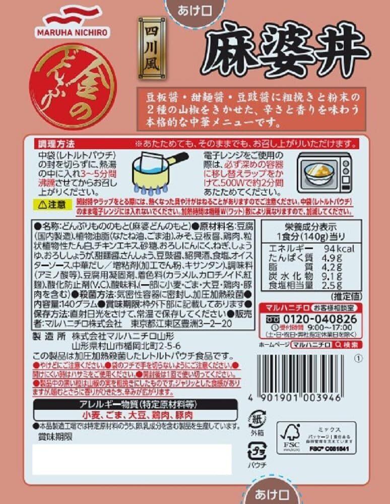 原材料:豆腐(国内製造)、植物油脂(なたね油、ごま油)、みそ、豆板醤、鶏肉、粒状植物性たん白、チキンエキス、砂糖、おろしにんにく、ねぎ、しょうゆ、おろししょうが、甜麺醤、さんしょう、豆鼓醤、紹興酒、食塩、オイスターソース、中華だし/増粘剤(加工でん粉、キサンタン)、調味料(アミノ酸等)、豆腐用凝固剤、着色料(カラメル、カロチノイド、紅麹)、酸化防止剤(V.C)、酸味料、(一部に小麦・ごま・大豆・鶏肉・豚肉を含む)