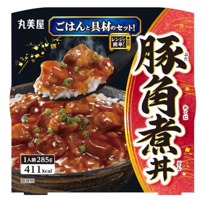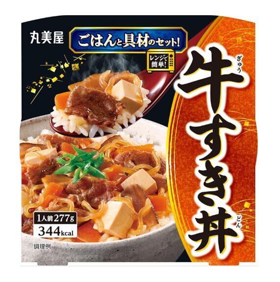 【牛すき丼】[ごはん]うるち米(国産)/酸味料[具材]豆腐、牛肉、しらたき、醤油、砂糖、にんじん、椎茸、ソテーオニオン、香味油、みりん、でん粉、たん白加水分解物、鰹節粉、酵母エキス/調味料(アミノ酸等)、トレハロース、加工でん粉、豆腐用凝固剤、pH調整剤、香料、水酸化カルシウム、酸化防止剤(ビタミンE)、香辛料抽出物、(一部に小麦・牛肉・大豆・豚肉を含む)【豚角煮丼】[ごはん]うるち米(国産)/酸味料[具材]豚肉、還元水あめ、醤油、発酵調味料、砂糖、ワイン、香味油、ポークエキス、食塩、生姜ペースト、香辛料/増粘剤(加工でん粉、キサンタン)、調味料(アミノ酸)、カラメル色素、(一部に小麦・大豆・豚肉を含む)【ハヤシライス】[ごはん]うるち米(国産)/酸味料[具材]玉ねぎ、粒状植物性たん白、牛肉、平茸、トマトペースト、砂糖、小麦粉ルウ、牛脂、ウスターソース、ミルポワペースト、ソテーオニオン、食塩、エキス(酵母、ビーフ)、たん白加水分解物、醤油、デキストリン、パーム油、玉ねぎ粉末、ぶどう糖、でん粉、水あめ/増粘剤(加工でん粉)、調味料(アミノ酸等)、カラメル色素、香料、(一部に小麦・牛肉・大豆・鶏肉・豚肉・りんごを含む)
