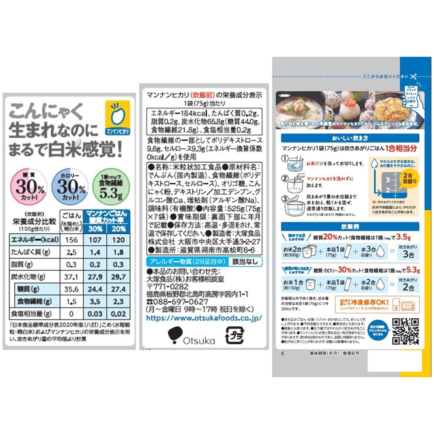※糖質・カロリー30%カット:炊きあがり2合の場合 お米1合とマンナンヒカリ75gで炊飯。「 日本食品標準成分表2020年版(八訂)」こめ(水稲めし、精白米)参照
