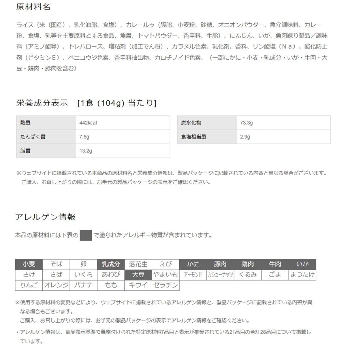 ライス(米(国産)、乳化油脂、食塩)、カレールゥ(豚脂、小麦粉、砂糖、オニオンパウダー、魚介調味料、カレー粉、食塩、乳等を主要原料とする食品、魚醤、トマトパウダー、香辛料、牛脂)、にんじん、いか、魚肉練り製品/調味料(アミノ酸等)、トレハロース、増粘剤(加工でん粉)、カラメル色素、乳化剤、香料、リン酸塩(Na)、酸化防止剤(ビタミンE)、ベニコウジ色素、香辛料抽出物、カロチノイド色素、(一部にかに・小麦・乳成分・いか・牛肉・大豆・鶏肉・豚肉を含む)