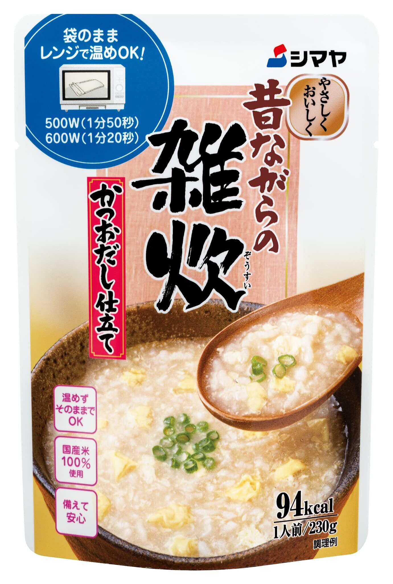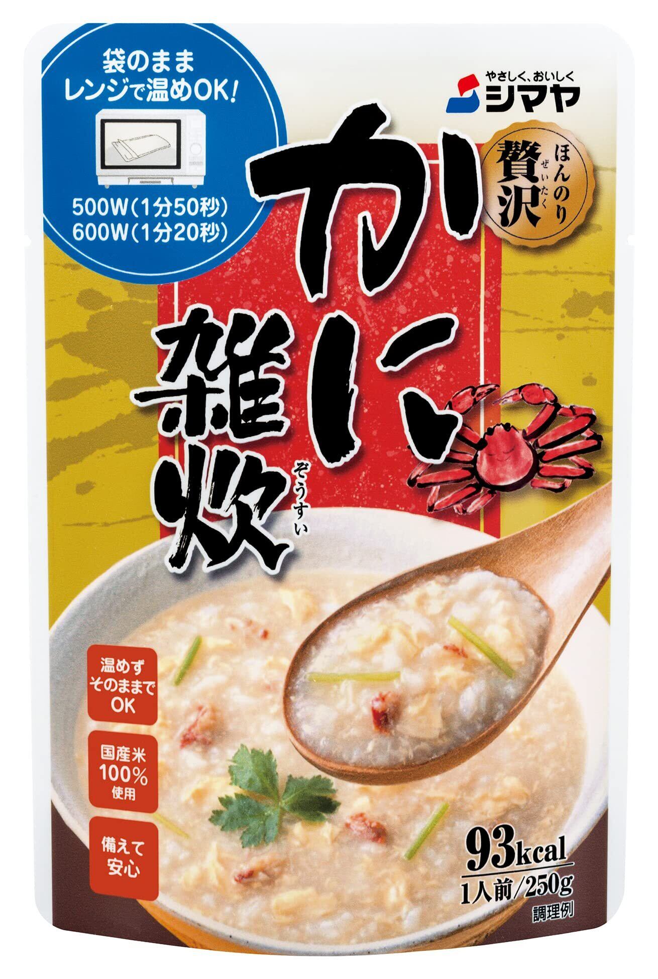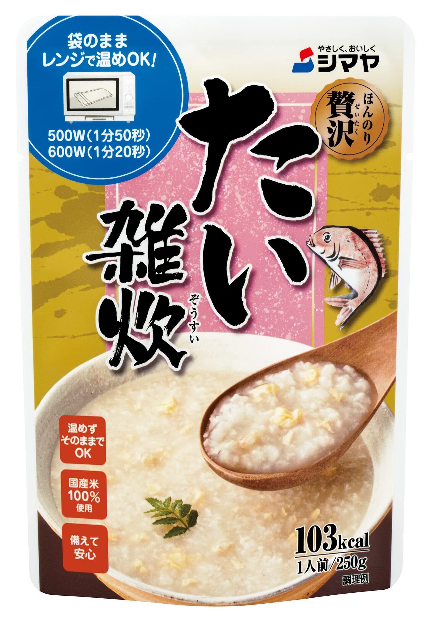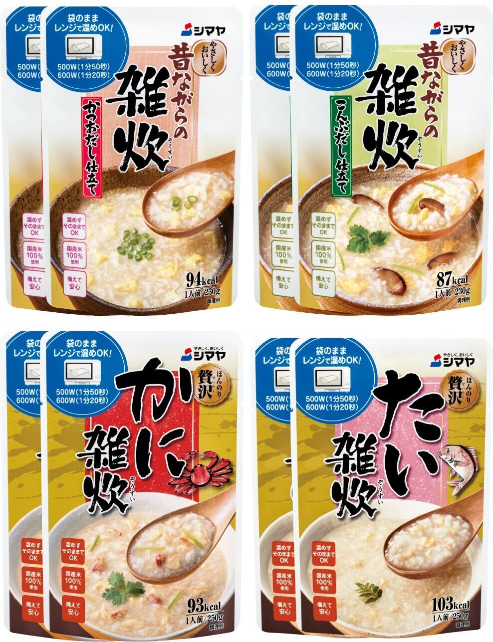 シマヤ ほんのり贅沢かに雑炊 250g、シマヤ ほんのり贅沢たい雑炊 250g、シマヤ 昔ながらの雑炊 かつおだし仕立て 230g、シマヤ 昔ながらの雑炊 こんぶだし仕立て 230g 各2袋