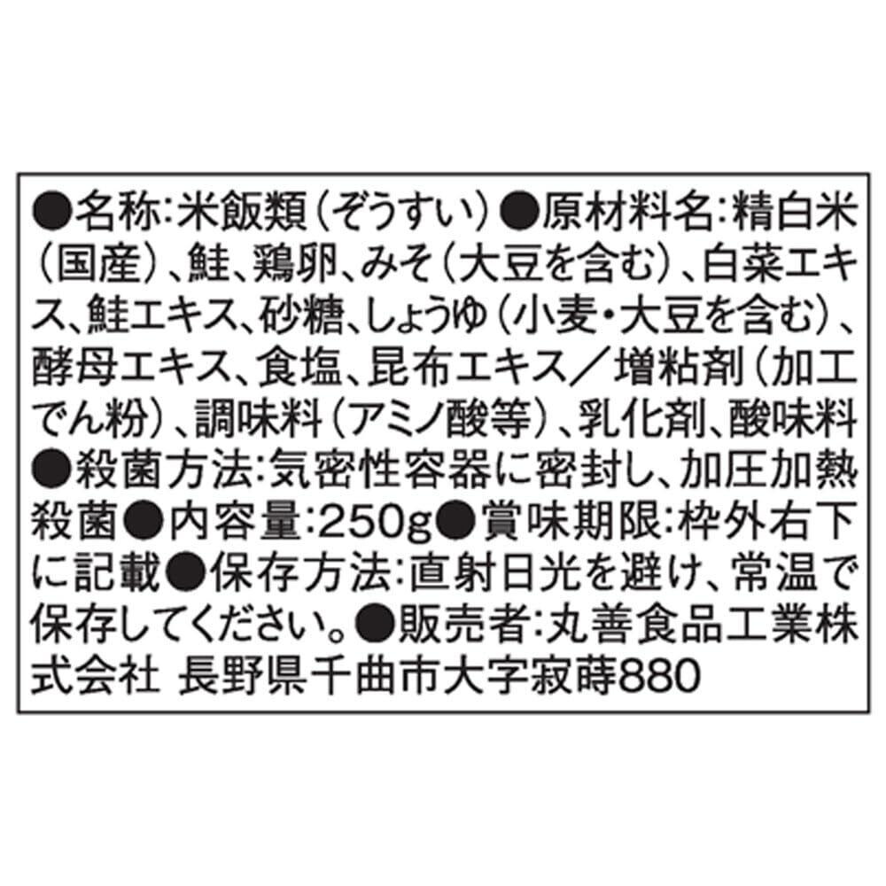 精白米(国産)、鮭、鶏卵、みそ(大豆を含む)、白菜エキス、鮭エキス、砂糖、しょうゆ(小麦・大豆を含む)、酵母エキス、食塩、昆布エキス/増粘剤(加工でん粉)、調味料(アミノ酸等)、乳化剤、酸味料