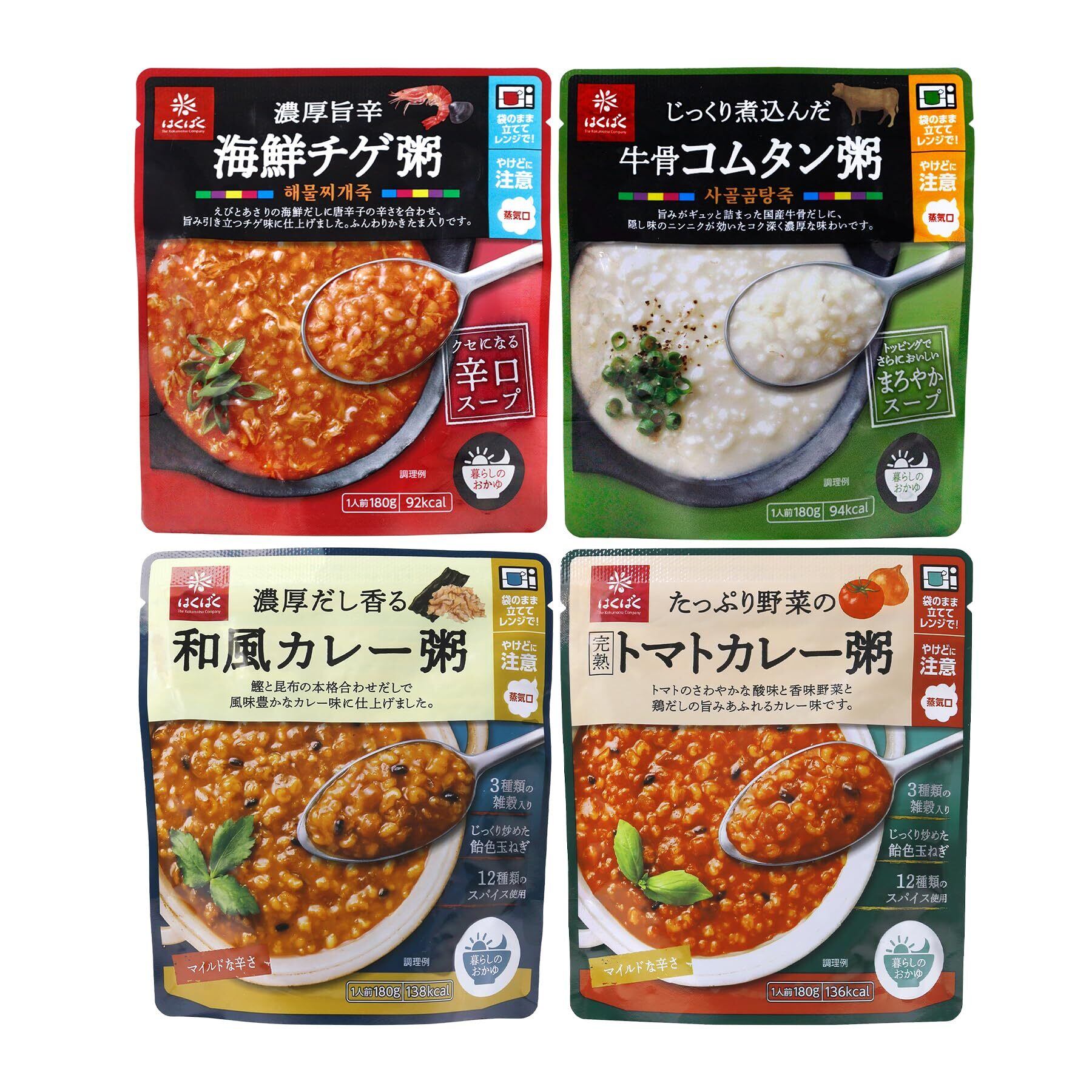 濃厚旨辛海鮮チゲ粥、じっくり煮込んだ牛骨コムタン粥、濃厚だし香る和風カレー粥、たっぷり野菜の完熟トマトカレー粥のセットです。