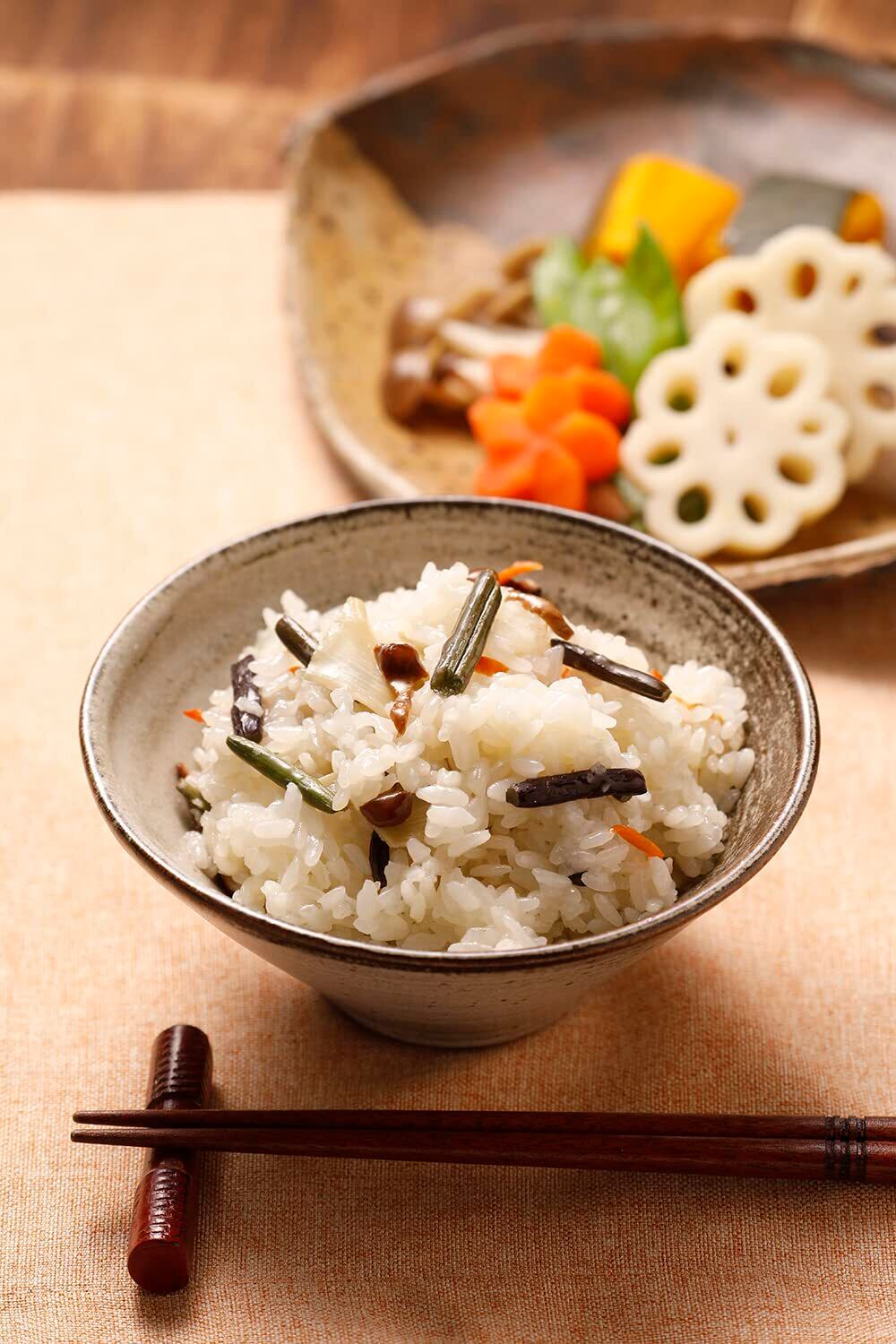 国産わらび・なめこ・たけのこ・にんじんを合わせ、彩り良く仕上げました。出雲仕込みの淡口醤油と利尻こんぶ出汁で、素材の風味を活かしています。
