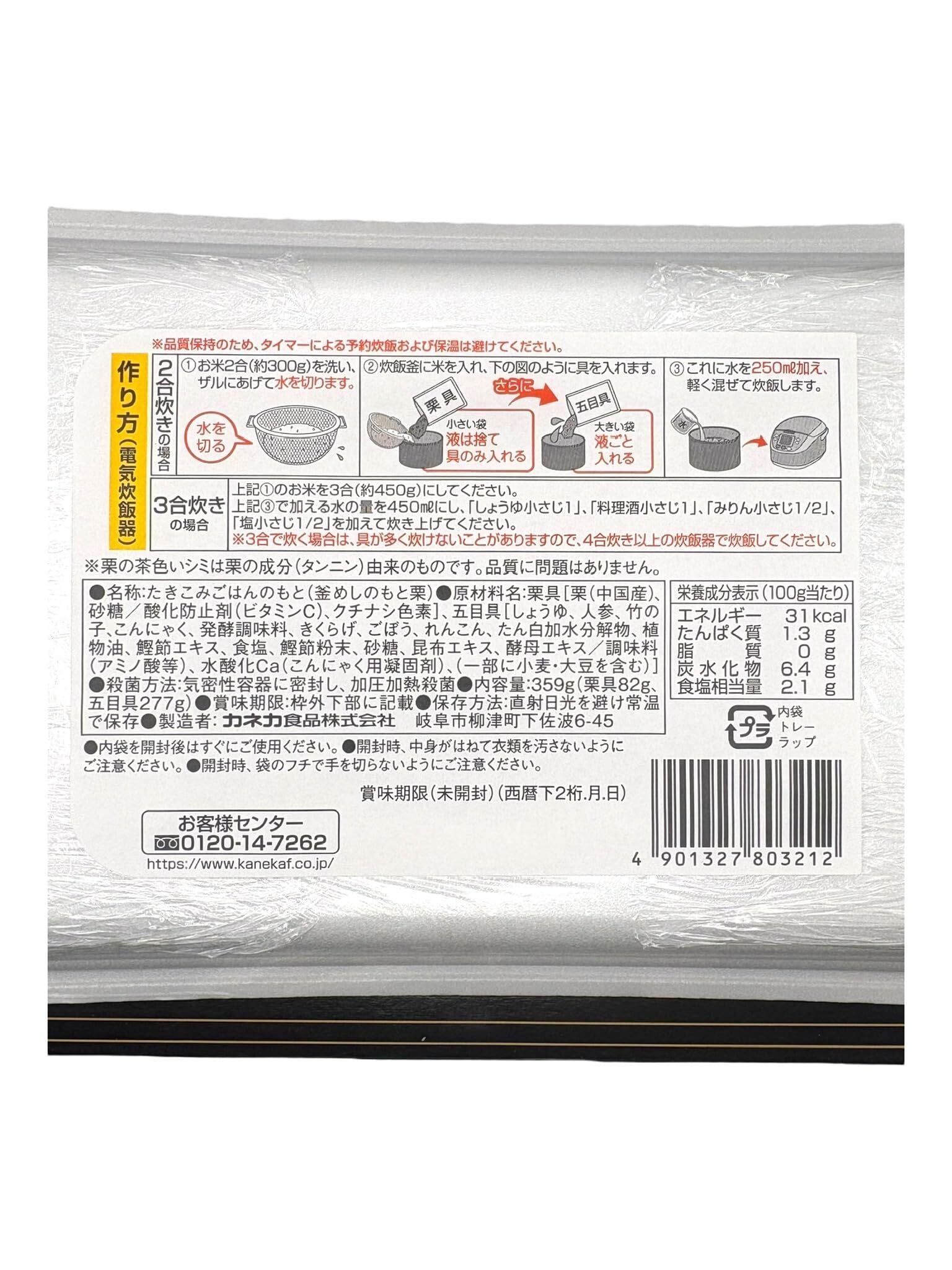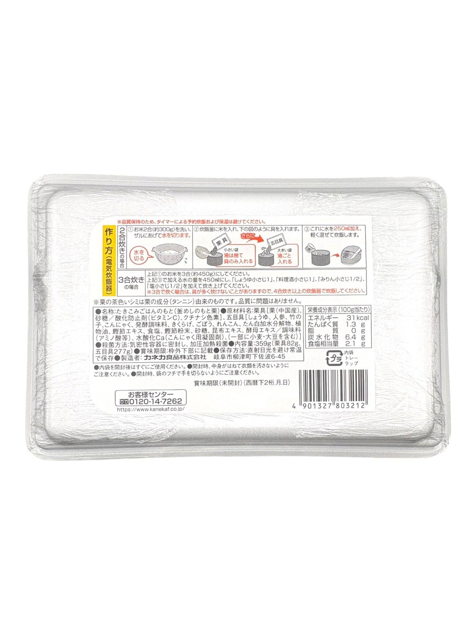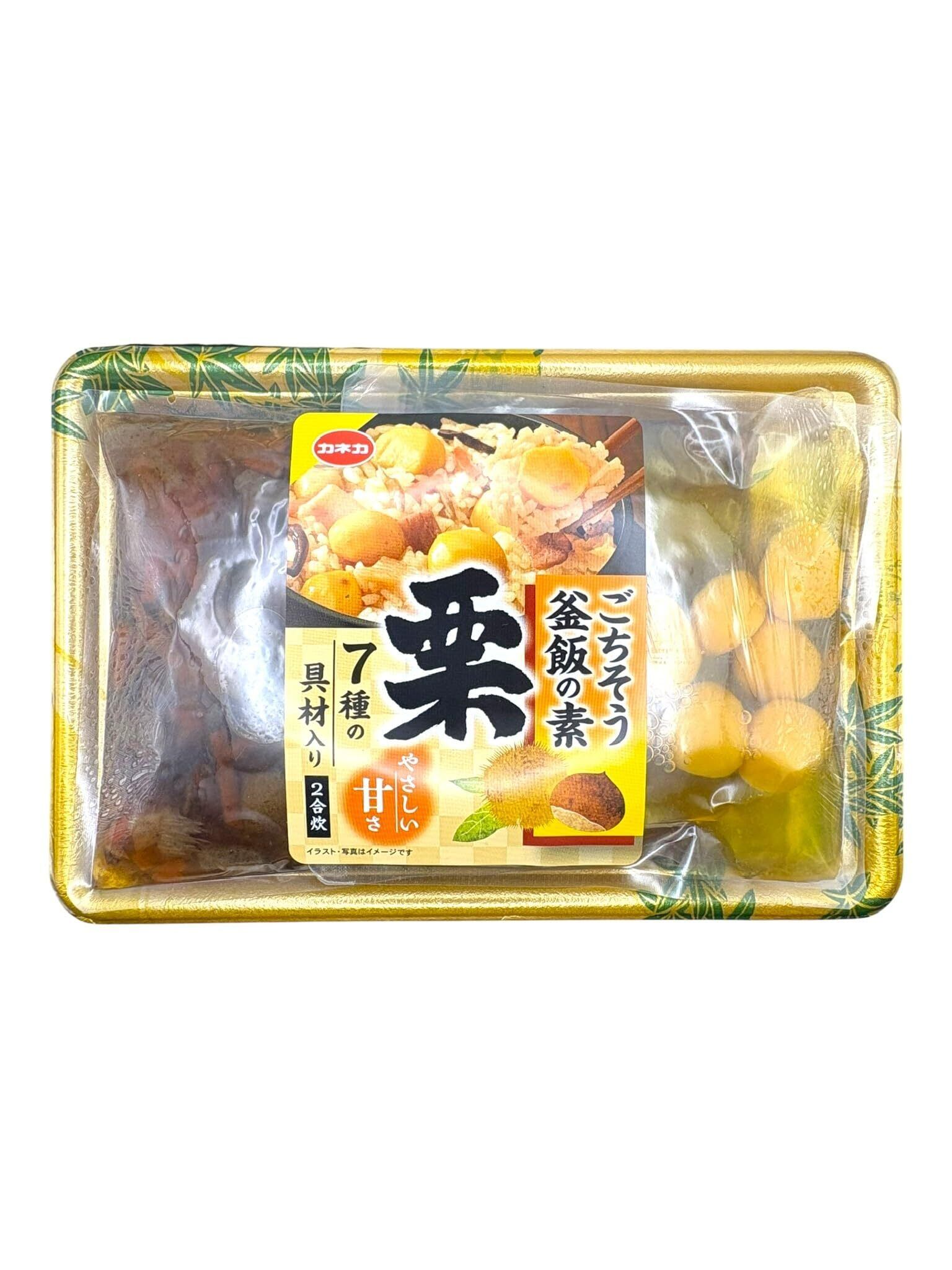 使用方法:2合炊き用(お米と一緒に炊飯器で調理) 原材料:栗(中国産)、鶏肉、ごぼう、にんじん、こんにゃく、たけのこ、しょうゆ、砂糖、昆布エキス、かつお節エキス ほか
