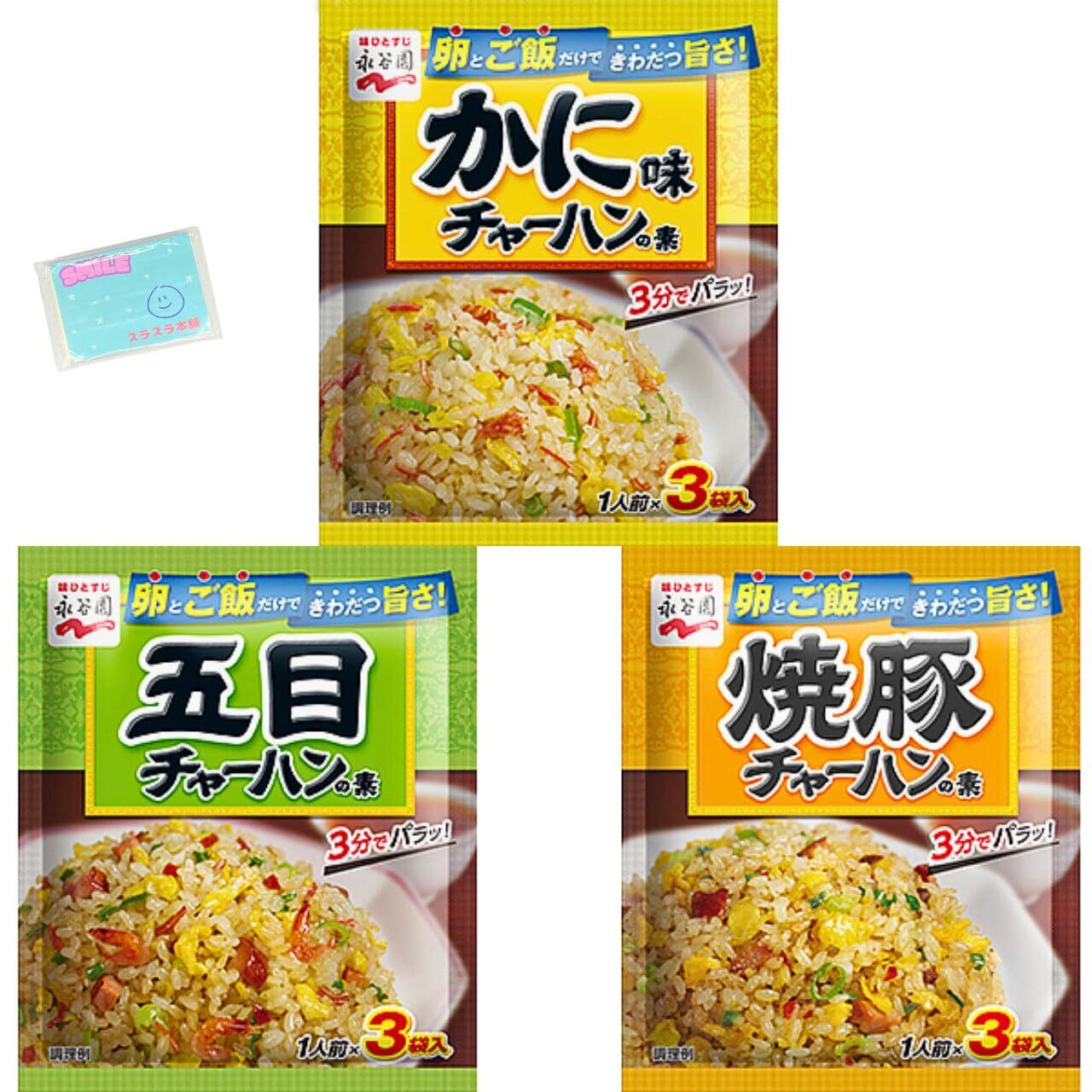 永谷園 チャーハンの素 3種アソートセット 【(1)かに味チャーハンの素 (2)焼豚チャーハンの素 (3)五目チャーハンの素 】 各種1袋ずつ 合計3袋セット スラスラ本舗オリジナルポケットティッシュ付き