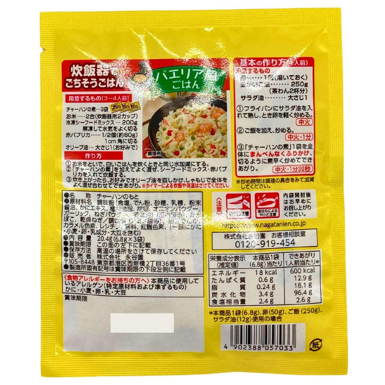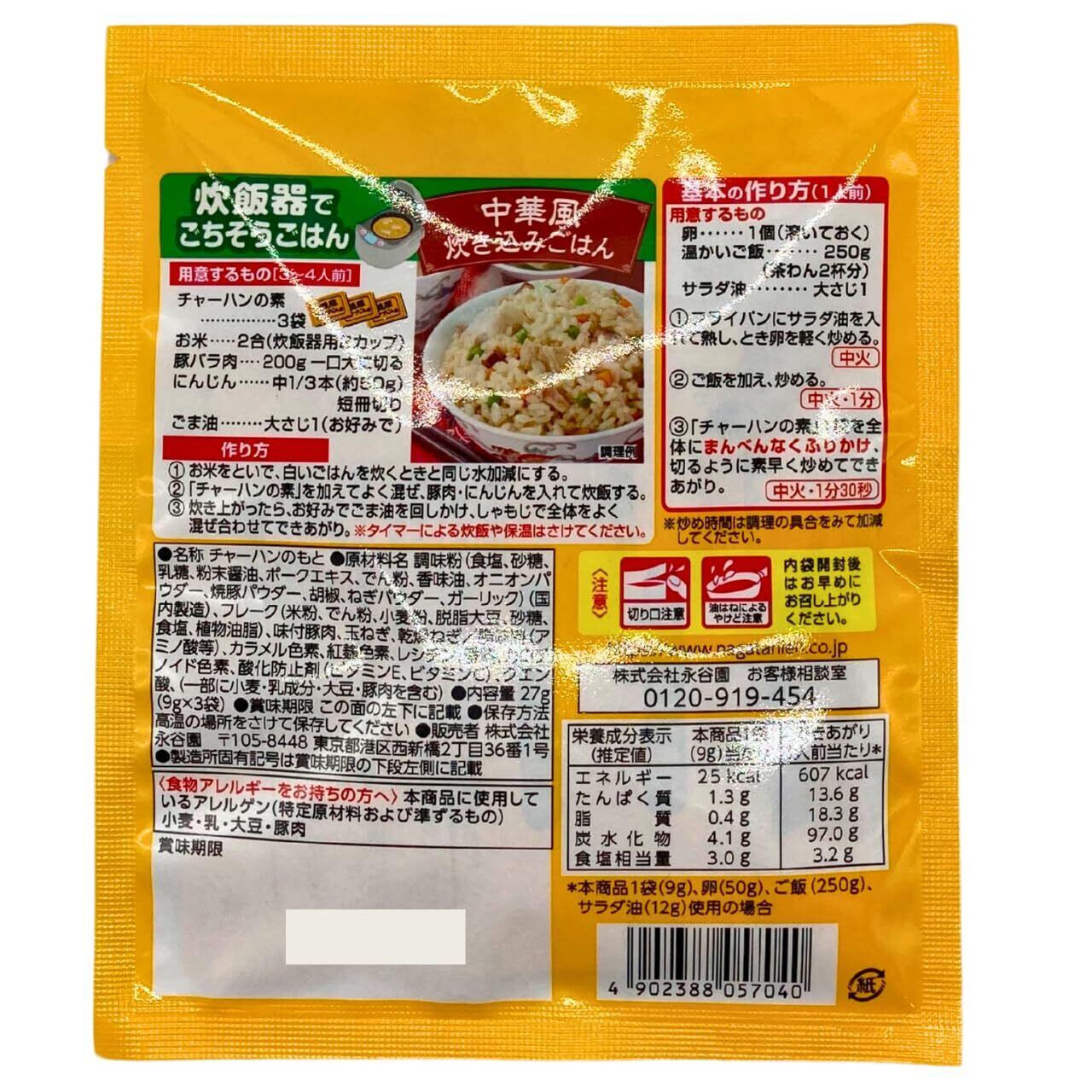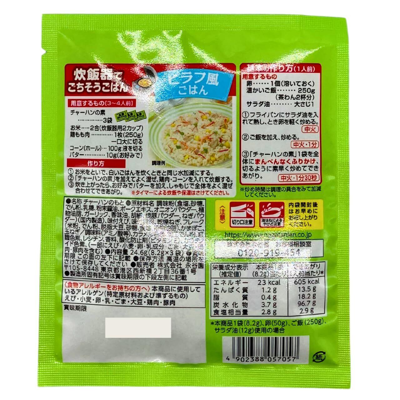 永谷園 チャーハンの素 3種アソートセット 【(1)かに味チャーハンの素 (2)焼豚チャーハンの素 (3)五目チャーハンの素 】 各種1袋ずつ 合計3袋セットです。 (1)かに味チャーハンの素 :かに風味かまぼこ、ねぎの具が入った粉末タイプのチャーハンの素です。 卵とご飯を用意してフライパンで3分炒めるだけで、簡単にパラッとしたおいしいチャーハンができあがります。かに香味油で、かにの風味が際立つ味わいに仕上げました。 (2)焼豚チャーハンの素 :香ばしく味付けした豚肉、ねぎなどの具が入った粉末タイプのチャーハンの素です。 卵とご飯を用意してフライパンで3分炒めるだけで、簡単にパラッとしたおいしいチャーハンができあがります。焼豚オイルで、焼豚の風味が際立つ味わいに仕上げました。 (3)五目チャーハンの素 :えび、鶏肉など五目の具が入った粉末タイプのチャーハンの素です。 卵とご飯を用意してフライパンで3分炒めるだけで、簡単にパラッとしたおいしいチャーハンができあがります。ねぎ香味油で、香ばしいねぎの風味が際立つ味わいに仕上げました。