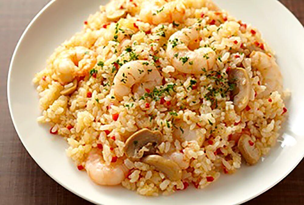 【炊込み法 50人分】生米5.3kg、むきえび1.3kg、玉ねぎ1kg、マッシュルームスライス500g、ピーマン250g、水6.9L、油180gと本品300gを一緒に炊いてください。