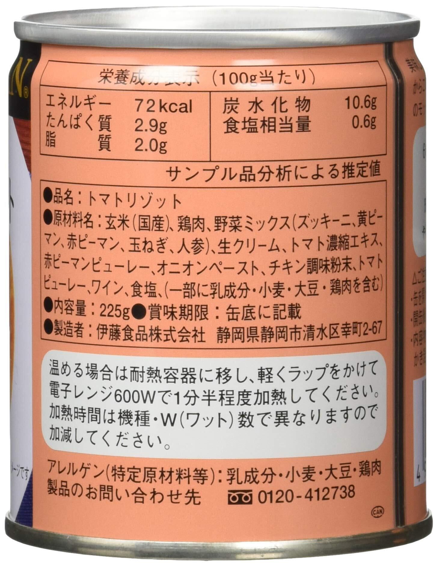原材料:玄米(国産)、鶏肉、野菜ミックス(ズッキーニ、黄ピーマン、赤ピーマン、玉ねぎ、人参)、生クリーム、トマト濃縮エキス、赤ピーマンピューレー、オニオンペースト、チキン調味粉末、トマトピューレー、ワイン、食塩、(一部に乳成分・小麦・大豆・鶏肉を含む)