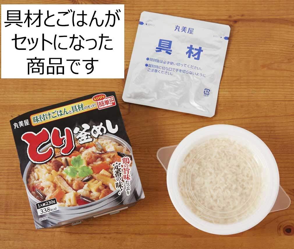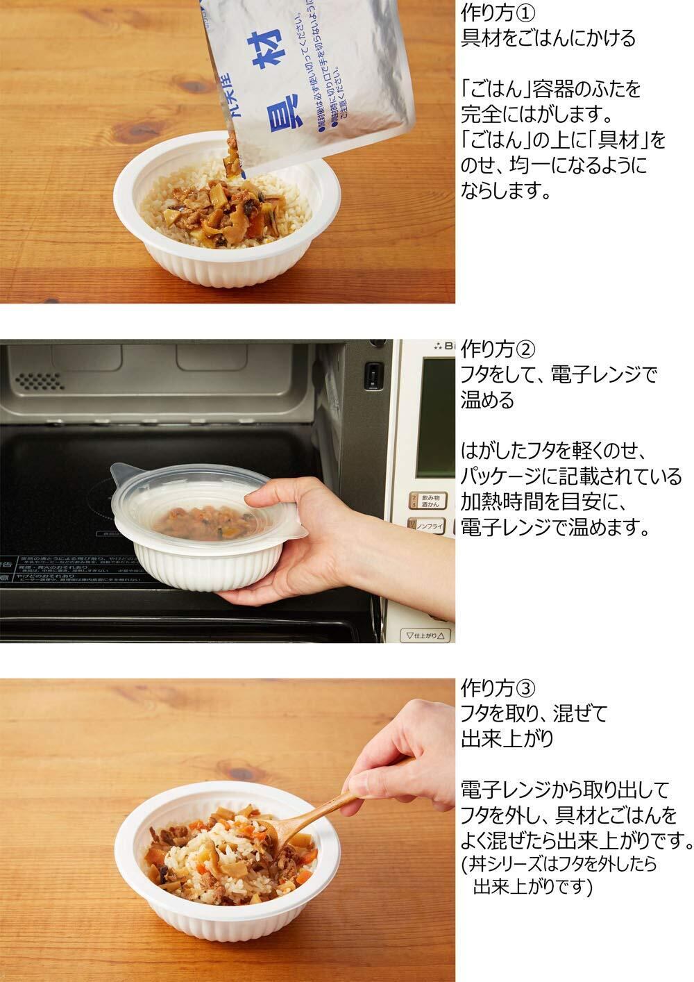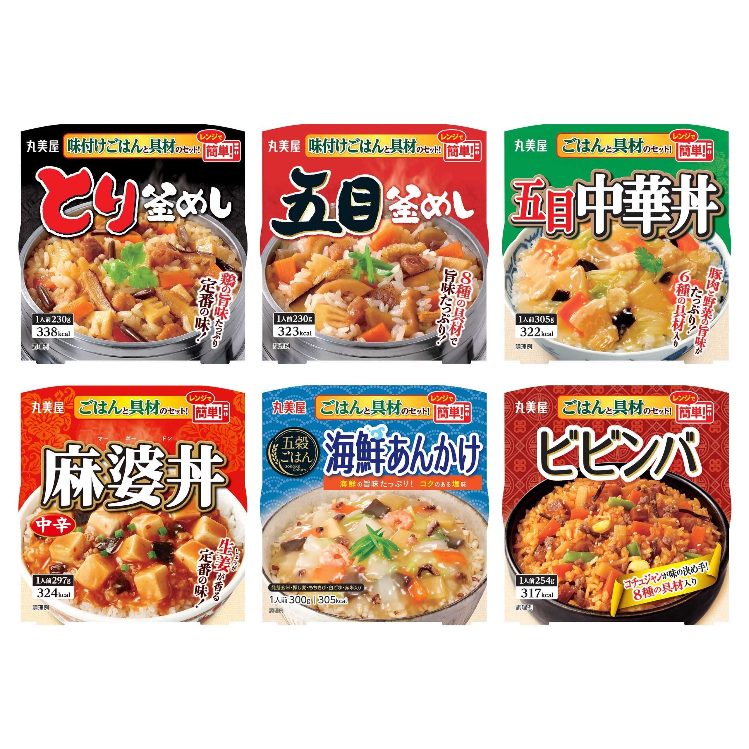 「とり釜めし味付けごはん付き」:[ごはん]うるち米(国産)、果糖ぶどう糖液糖、発酵調味料、醤油、食塩、チキンエキス/酸味料、(一部に小麦・大豆・鶏肉を含む)[具材]野菜(にんじん、筍、わらび)、鶏肉、醤油、椎茸、発酵調味料、砂糖、大豆油、たん白加水分解物、エキス(鰹節、酵母)/調味料(アミノ酸等)、(一部に小麦・大豆・鶏肉・豚肉を含む)| 「五目釜めし味付けごはん付き」:[ごはん]うるち米(国産)、果糖ぶどう糖液糖、発酵調味料、醤油、食塩、チキンエキス/酸味料、(一部に小麦・大豆・鶏肉を含む)[具材]野菜(にんじん、ごぼう、筍、れんこん)、鶏肉、こんにゃく、醤油、椎茸、発酵調味料、油揚げ、砂糖、大豆油、食塩、エキス(鰹節、酵母)、酵母エキスパウダー/調味料(アミノ酸)、(一部に小麦・大豆・鶏肉を含む)| 「五目中華丼ごはん付き」:[ごはん]うるち米(国産)/酸味料[具材]野菜(筍、にんじん、白菜、ヤングコーン)、豚肉、きくらげ、ごま油、砂糖、ソテーオニオン、エキス(酵母、あさり、チキン、帆立)、にんにくペースト、醤油、生姜ペースト、食塩、りんご酢、胡椒/増粘剤(加工でん粉)、調味料(アミノ酸等)、(一部に小麦・ごま・大豆・鶏肉・豚肉・りんごを含む)| 「麻婆丼<中辛>ごはん付き」:[ごはん]うるち米(国産)/酸味料[具材]豆腐、鶏肉、きくらげ、粒状植物性たん白、醤油、砂糖、豆板醤、ごま油、エキス(チキン、酵母)、大豆油、にんにくペースト、生姜ペースト、たん白加水分解物、食塩、りんごペースト、りんご酢/増粘剤(加工でん粉、増粘多糖類)、調味料(アミノ酸等)、トレハロース、豆腐用凝固剤、着色料(カラメル、カロチノイド)、(一部に小麦・ごま・大豆・鶏肉・豚肉・りんごを含む)| 「五穀ごはん海鮮あんかけ」:[ごはん]うるち米(精白米(国産)、発芽玄米(国産))、大麦、きび、いりごま、赤米(国産)、チキンエキス/酸味料、トレハロース、(一部にごま・鶏肉を含む)[具材]野菜(白菜、筍、にんじん、生姜)、魚肉(いか、えび)、きくらげ、ごま油、砂糖、食塩、エキス(チキン、ポーク、鰹)、にんにくペースト、香辛料、たん白加水分解物、香味油、酵母エキスパウダー/増粘剤(加工でん粉、キサンタン)、調味料(アミノ酸等)、pH調整剤、(一部にえび・いか・ごま・大豆・鶏肉・豚肉を含む)| 「ビビンバごはん付き」:[ごはん]うるち米(国産)/酸味料[具材]野菜(にんじん、筍、れんこん、大豆もやし、山くらげ)、コチュジャン、砂糖、醤油、ごま油、牛肉、きくらげ、にんにくペースト、ごま、香味油、魚介エキス、食塩、香辛料/調味料(アミノ酸)、増粘剤(キサンタン)、カロチノイド色素、(一部に小麦・牛肉・ごま・大豆を含む)
