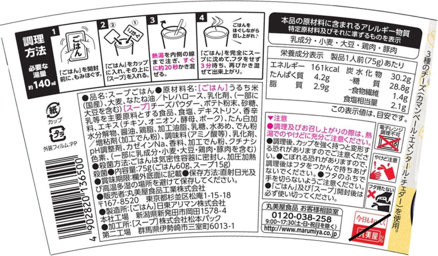 原材料:[ごはん]うるち米(国産)、大麦、なたね油/トレハロース、乳化剤、(一部に大豆を含む)[スープ]チーズパウダー、ポテト粉末、砂糖、乳等を主要原料とする食品、食塩、デキストリン、香辛料、エキス(チキン、オニオン、酵母、ポーク)、たん白加水分解物、醤油、鶏脂、加工油脂、乳糖、水あめ、でん粉/増粘剤(加工でん粉)、調味料(アミノ酸等)、乳化剤、pH調整剤、カゼインNa、香料、加工でん粉、クチナシ色素、(一部に乳成分・小麦・大豆・鶏肉・豚肉を含む)