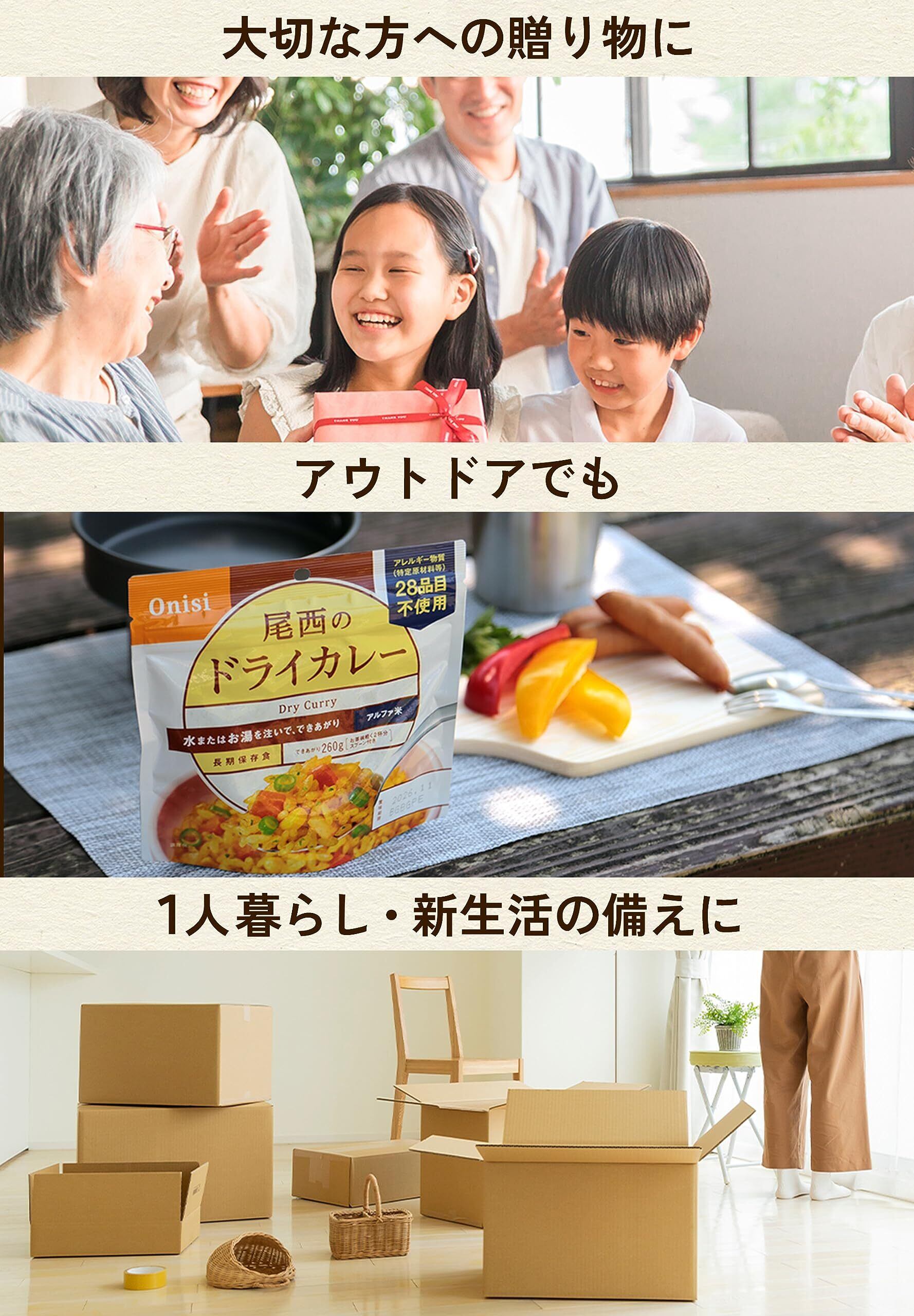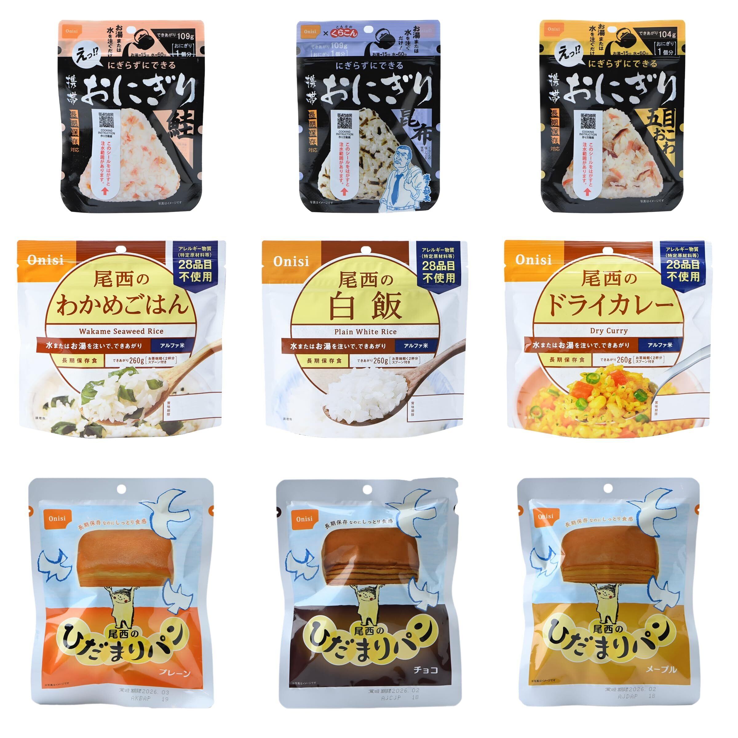【セット内容】 尾西のひだまりパン:プレーン×1、メープル×1、チョコ×1 携帯おにぎり:鮭×1、五目おこわ×1、昆布×1 アルファ米:白飯×1、わかめ×1、ドライカレー×1 (合計9袋)