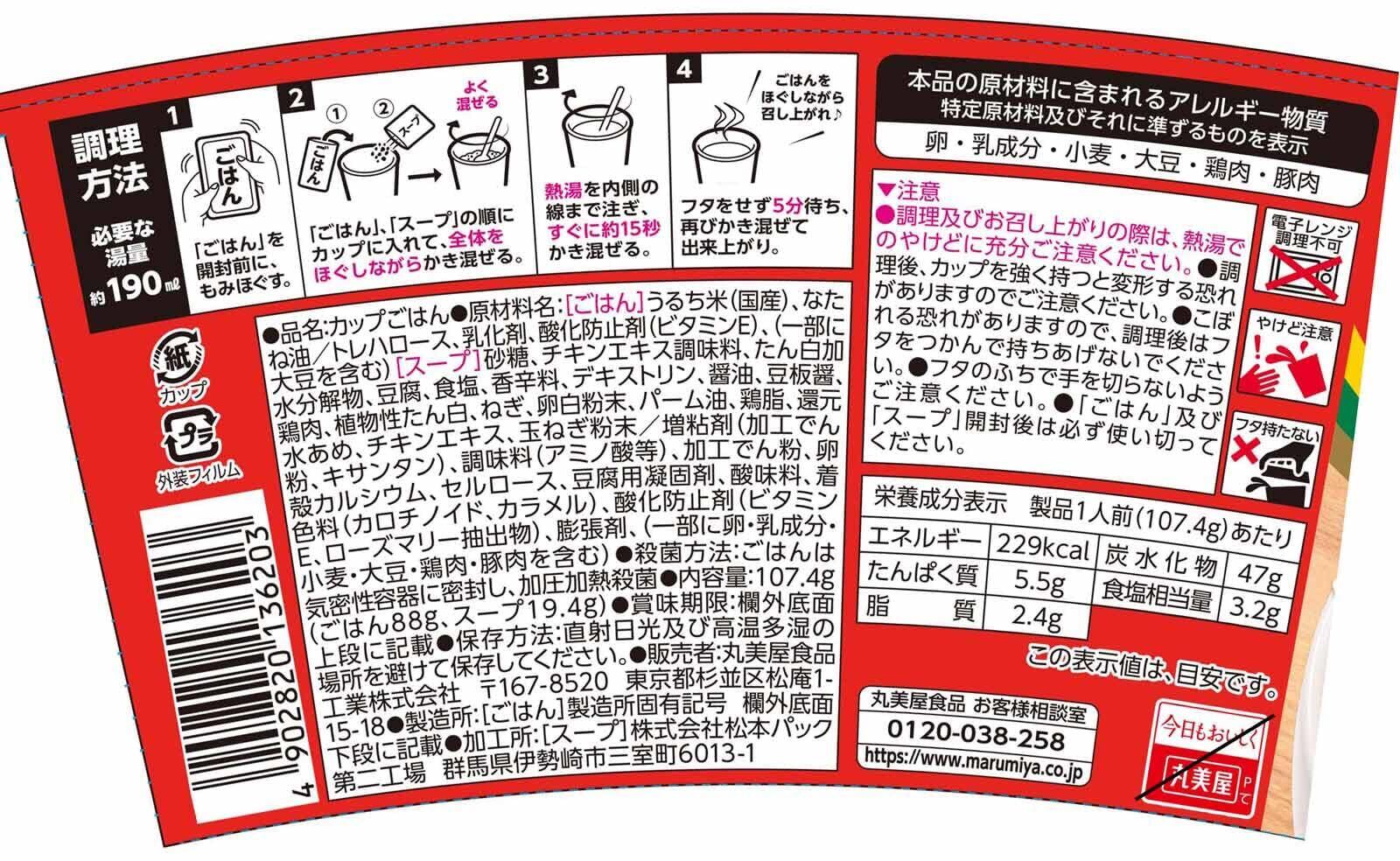 原材料:[ごはん]うるち米(国産)、なたね油/トレハロース、乳化剤、酸化防止剤(ビタミンE)、(一部に大豆を含む)| [スープ]砂糖、チキンエキス調味料、たん白加水分解物、豆腐、食塩、香辛料、デキストリン、醤油、豆板醤、鶏肉、植物性たん白、ねぎ、卵白粉末、パーム油、鶏脂、還元水あめ、チキンエキス、玉ねぎ粉末/増粘剤(加工でん粉、キサンタン)、調味料(アミノ酸等)、加工でん粉、卵殻カルシウム、セルロース、豆腐用凝固剤、酸味料、着色料(カロチノイド、カラメル)、酸化防止剤(ビタミンE、ローズマリー抽出物)、膨張剤、(一部に卵・乳成分・小麦・大豆・鶏肉・豚肉を含む)
