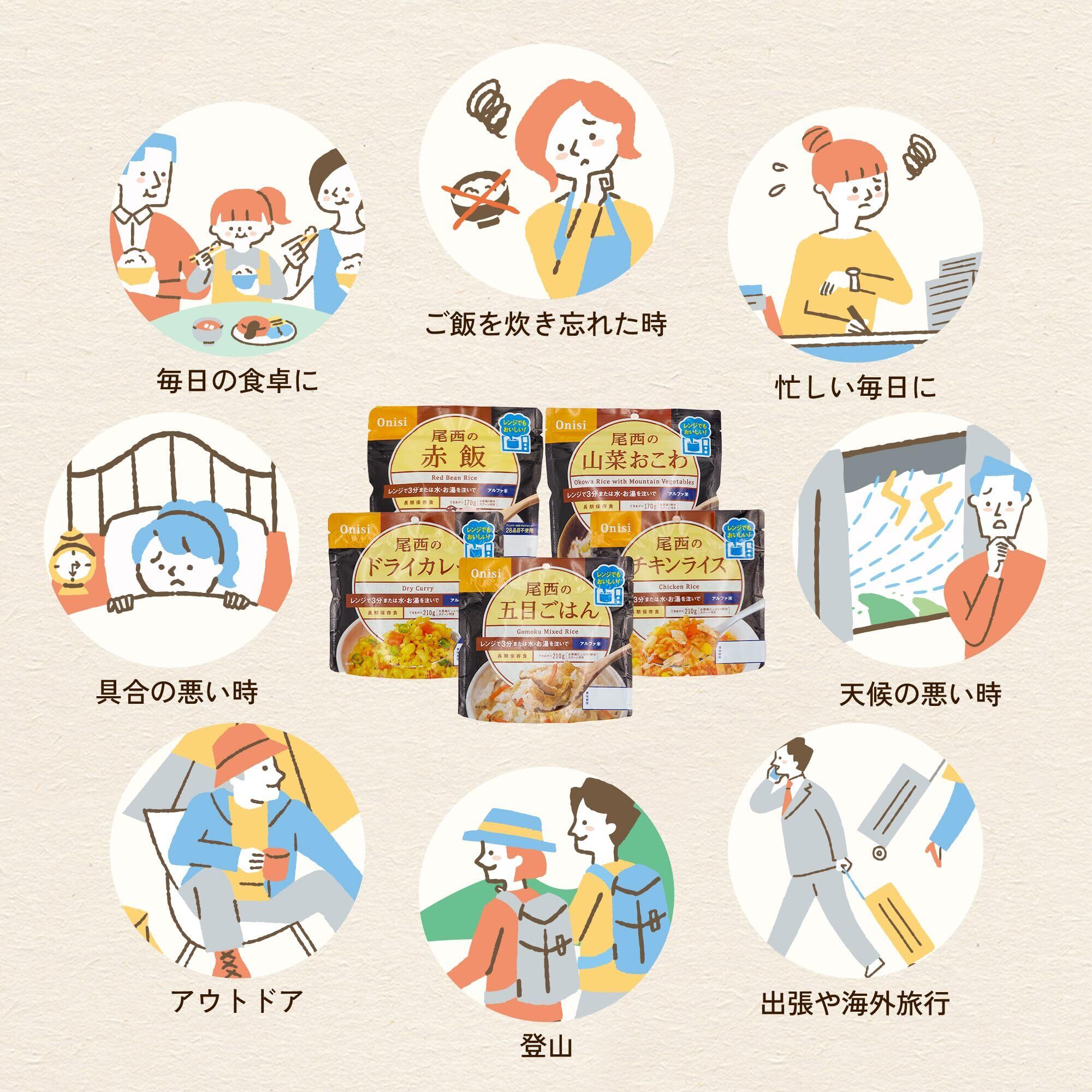 炊きたてのご飯をそのままに急速乾燥させた長期保存食アルファ米、お水を入れるだけで食べることが出来ます。スプーン付きなので食器いらず。五目ごはんは肉や魚を一切使わない、野菜中心の5種の具たっぷりのまぜごはん。お米は国産うるち米のみ使用しております。レンジプラスシリーズは電子レンジで調理することで、さらにアルファ米を美味しく食べることができるようになりました。災害以外のあらゆる「いざ」という場面でお使いください。こちらの商品の賞味期限は2028年12月末日までとなっております。