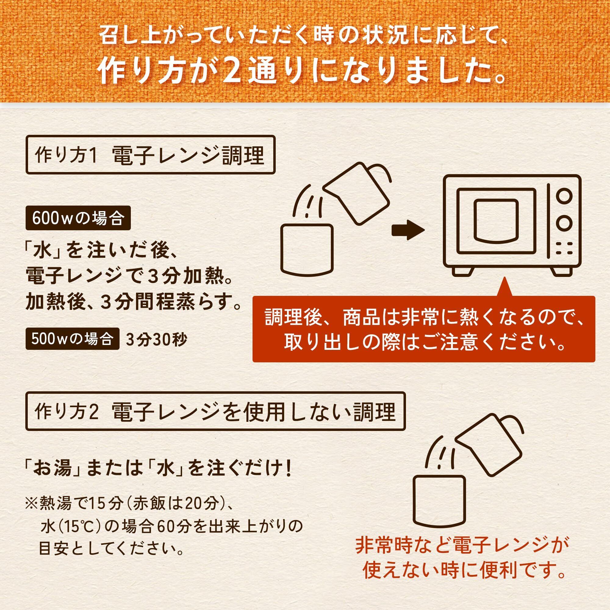 作り方が2通りになりました! 作り方➀電子レンジ調理:「水」を注いだ後、電子レンジで3分(600wの場合)。 作り方➁水分のみで調理:お湯で15分、お水で60分を注いで待つだけ