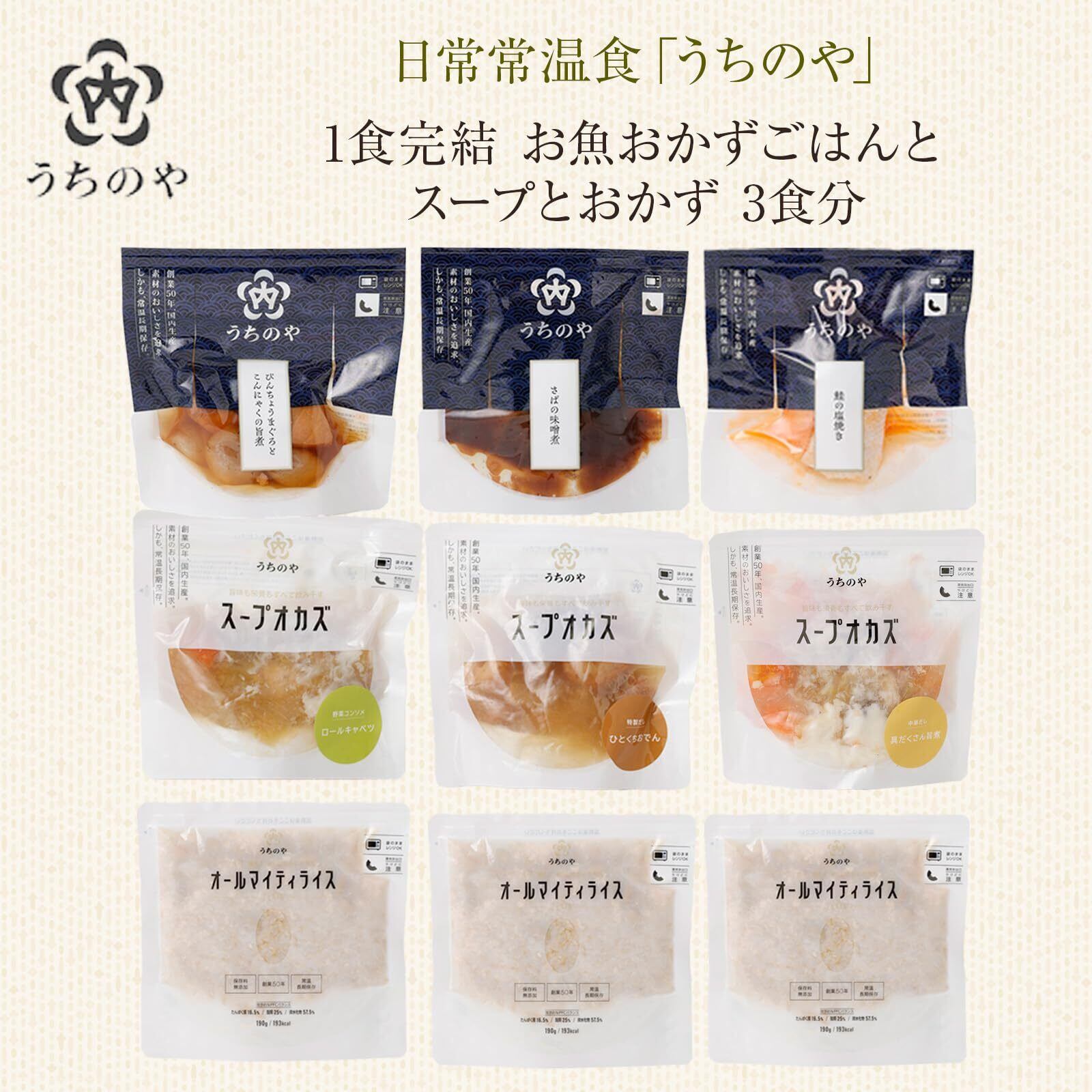 常温備食生活 うちのや 1食完結 お魚おかず ごはん スープ 3食分 9セット 惣菜 お惣菜 レトルト食品 保存料 着色料 無添加 常温保存 非常食 備蓄食 鮭 さば おでん ロールキャベツ