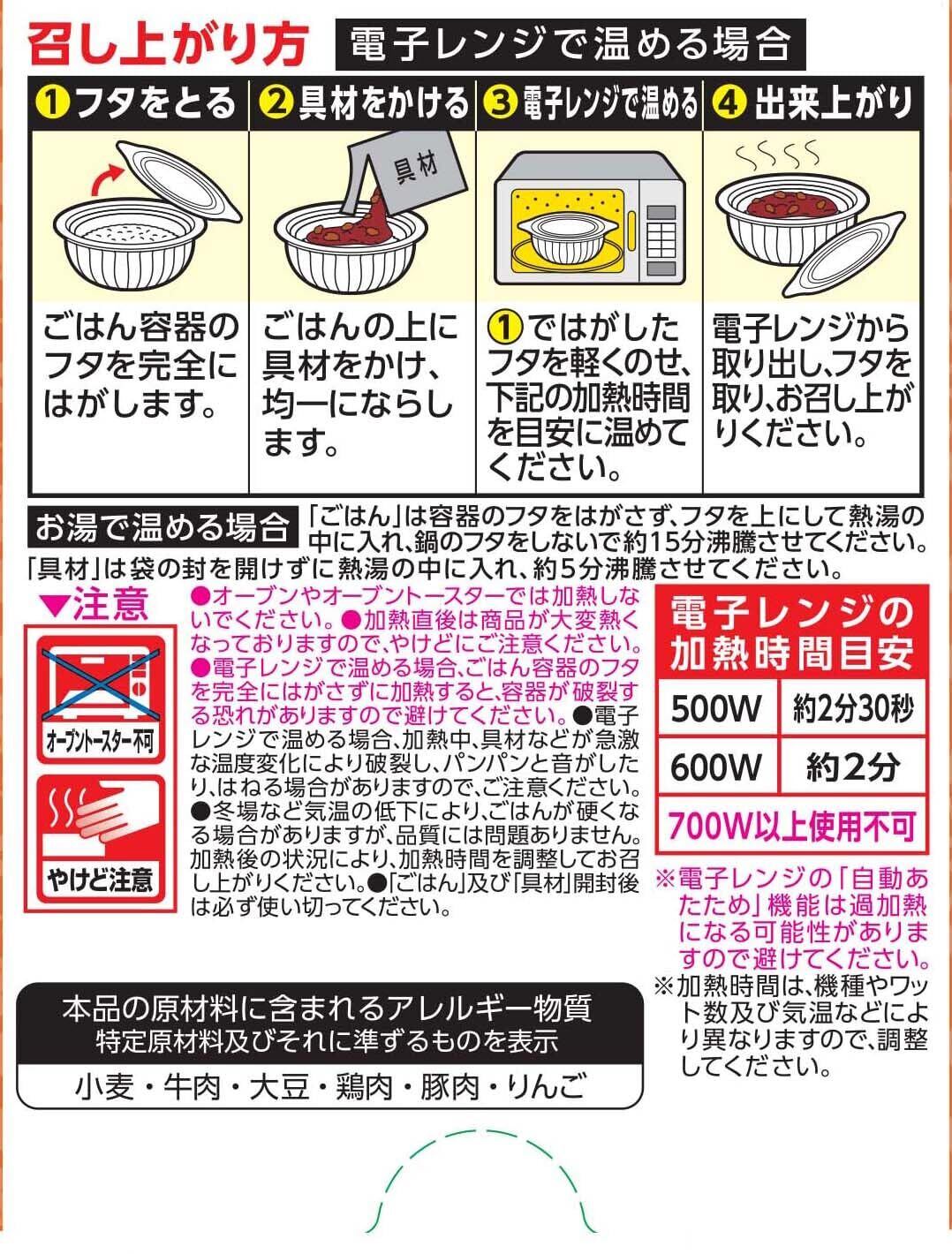 原材料:[ごはん]うるち米(国産)/酸味料| [具材]玉ねぎ、粒状植物性たん白、牛肉、平茸、トマトペースト、砂糖、小麦粉ルウ、牛脂、ウスターソース、ミルポワペースト、ソテーオニオン、食塩、エキス(酵母、ビーフ)、たん白加水分解物、醤油、デキストリン、パーム油、玉ねぎ粉末、ぶどう糖、でん粉、水あめ/増粘剤(加工でん粉)、調味料(アミノ酸等)、カラメル色素、香料、(一部に小麦・牛肉・大豆・鶏肉・豚肉・りんごを含む)