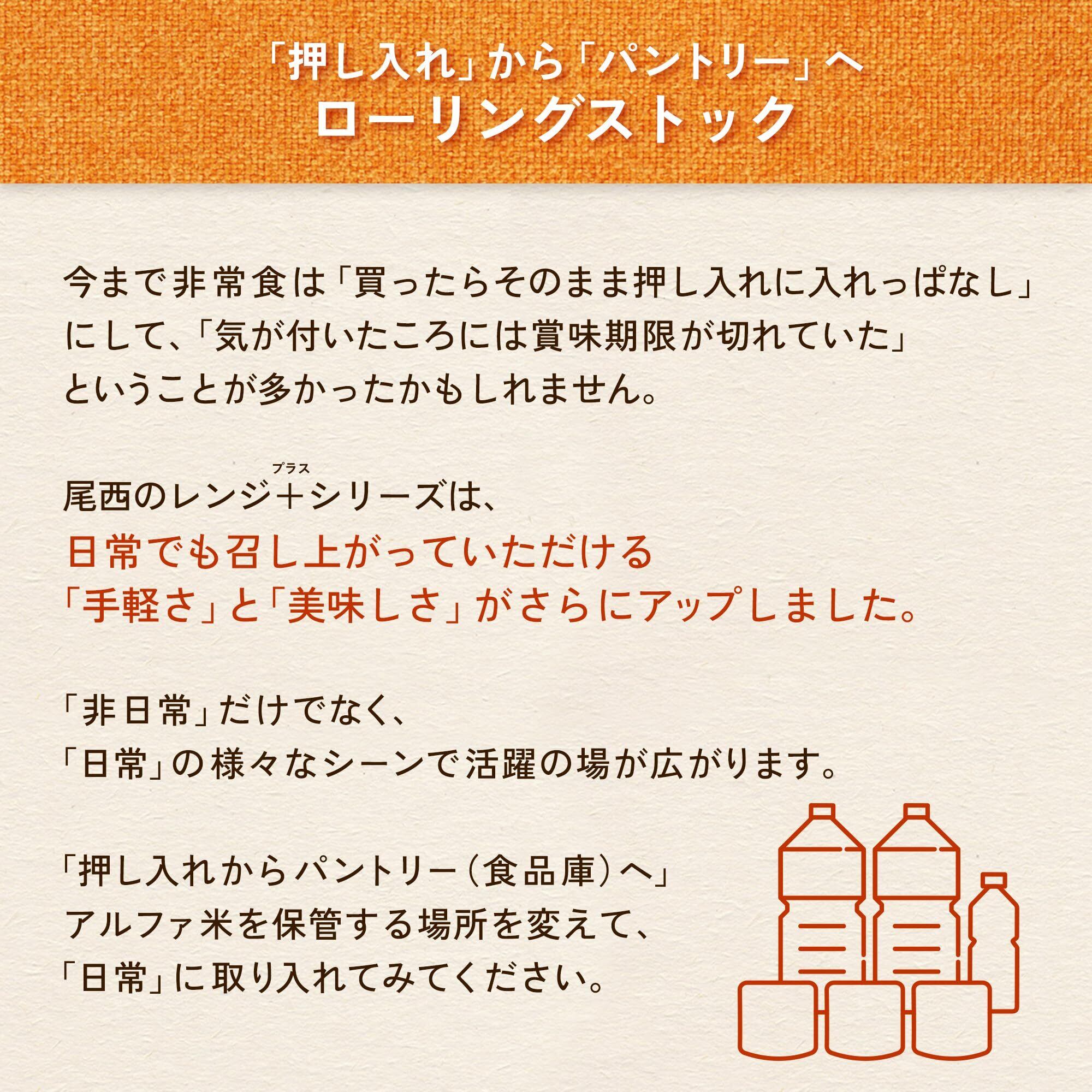 アルファ米とは・・・ 炊きたてのご飯をそのままに急速乾燥した長期保存食です。お水かお湯を入れるだけで美味しく食べられます。100%国産米使用