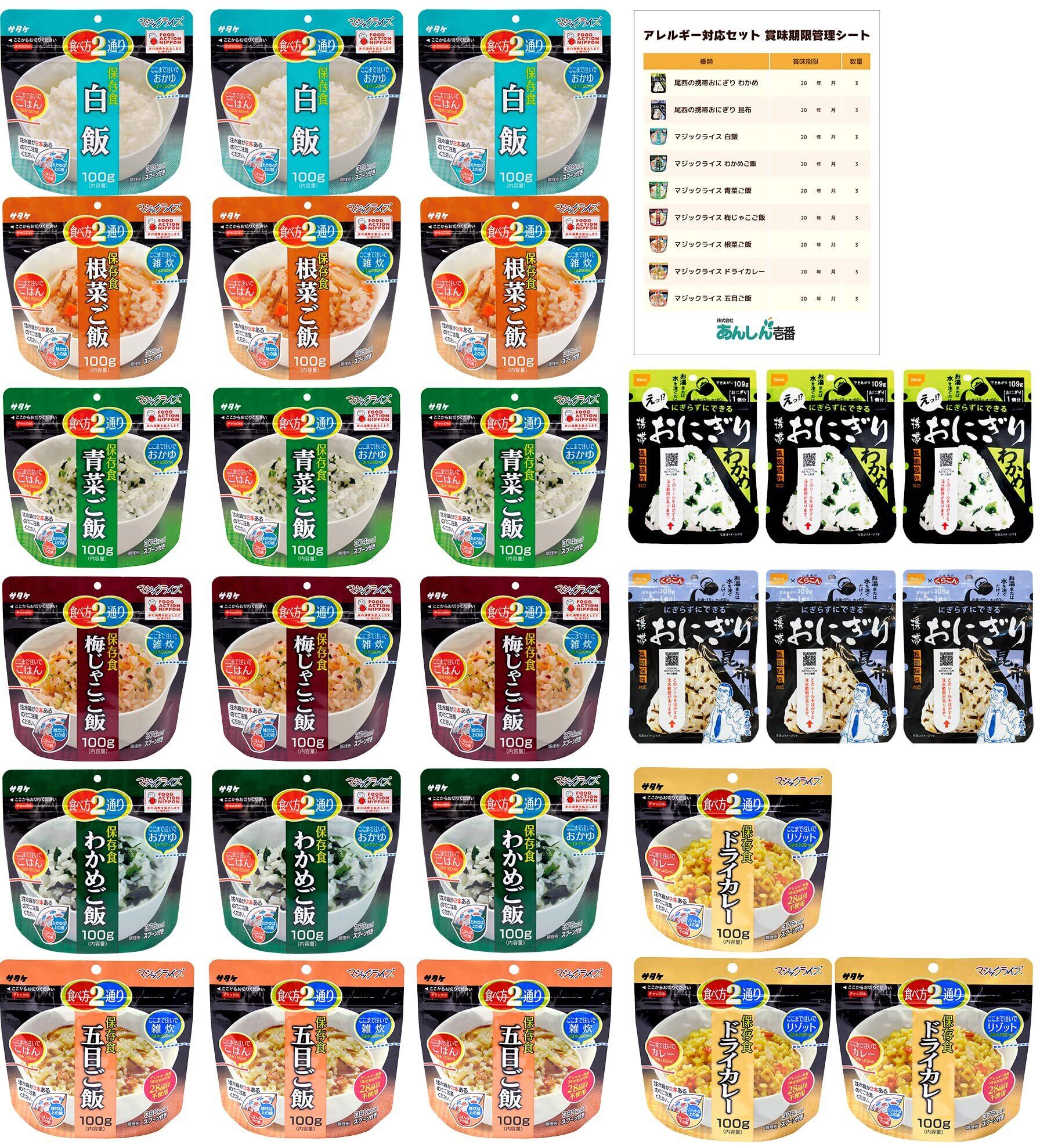 非常食 5年保存 アレルギー対応 アルファ米 3人家族 3日分 保存食品 長期保存 お米 白米 尾西食品 携帯おにぎり サタケ マジックライス ご飯 9種類 27食セット
