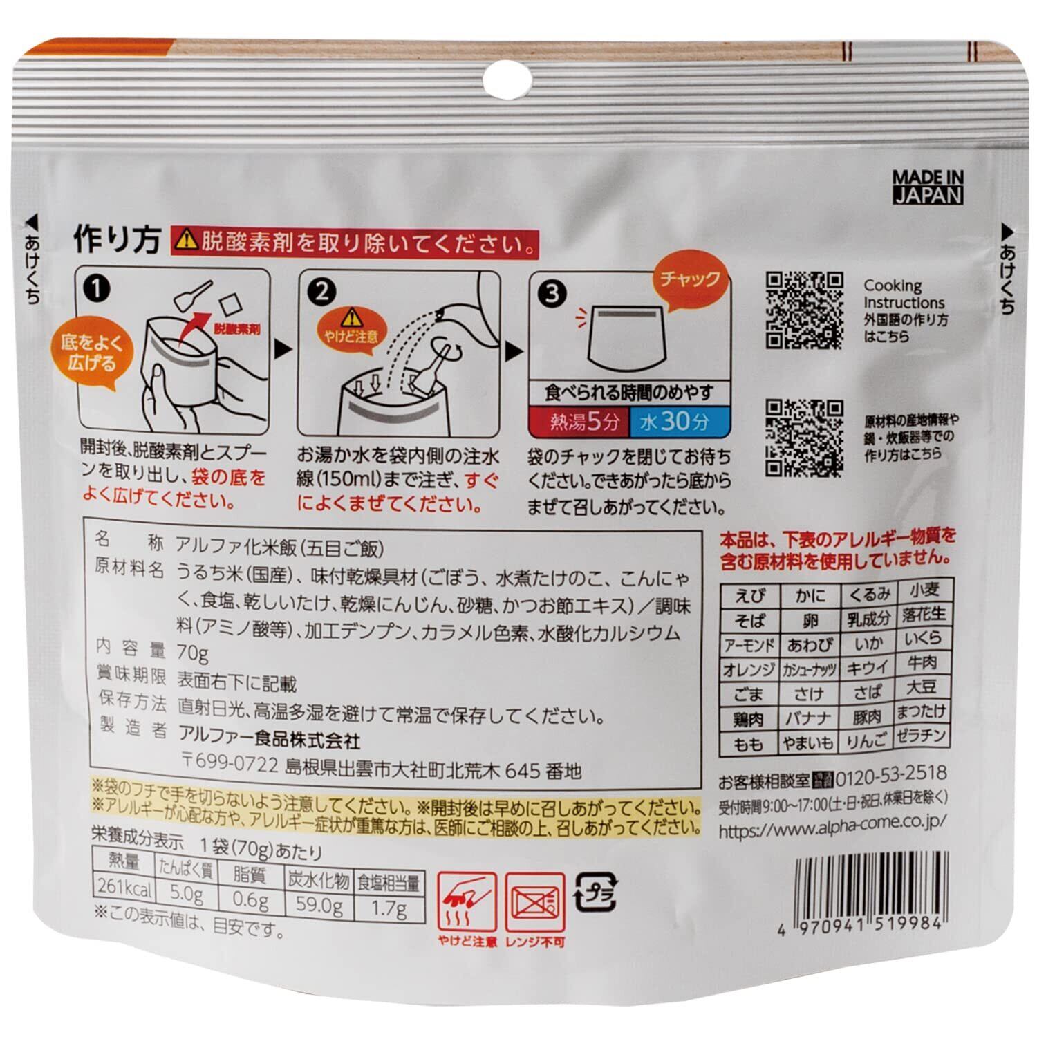 お湯を注いで5分!お水でも30分でできますので、通常のアルファ化米より、早く食べる事ができます。