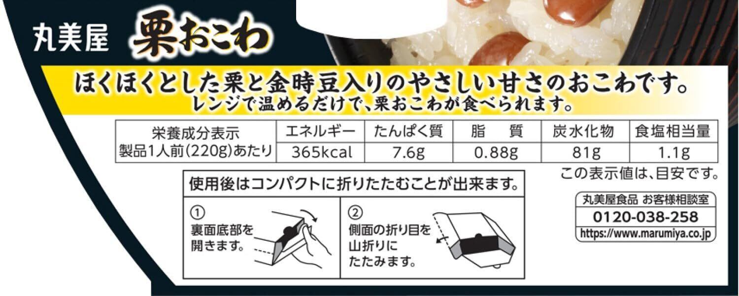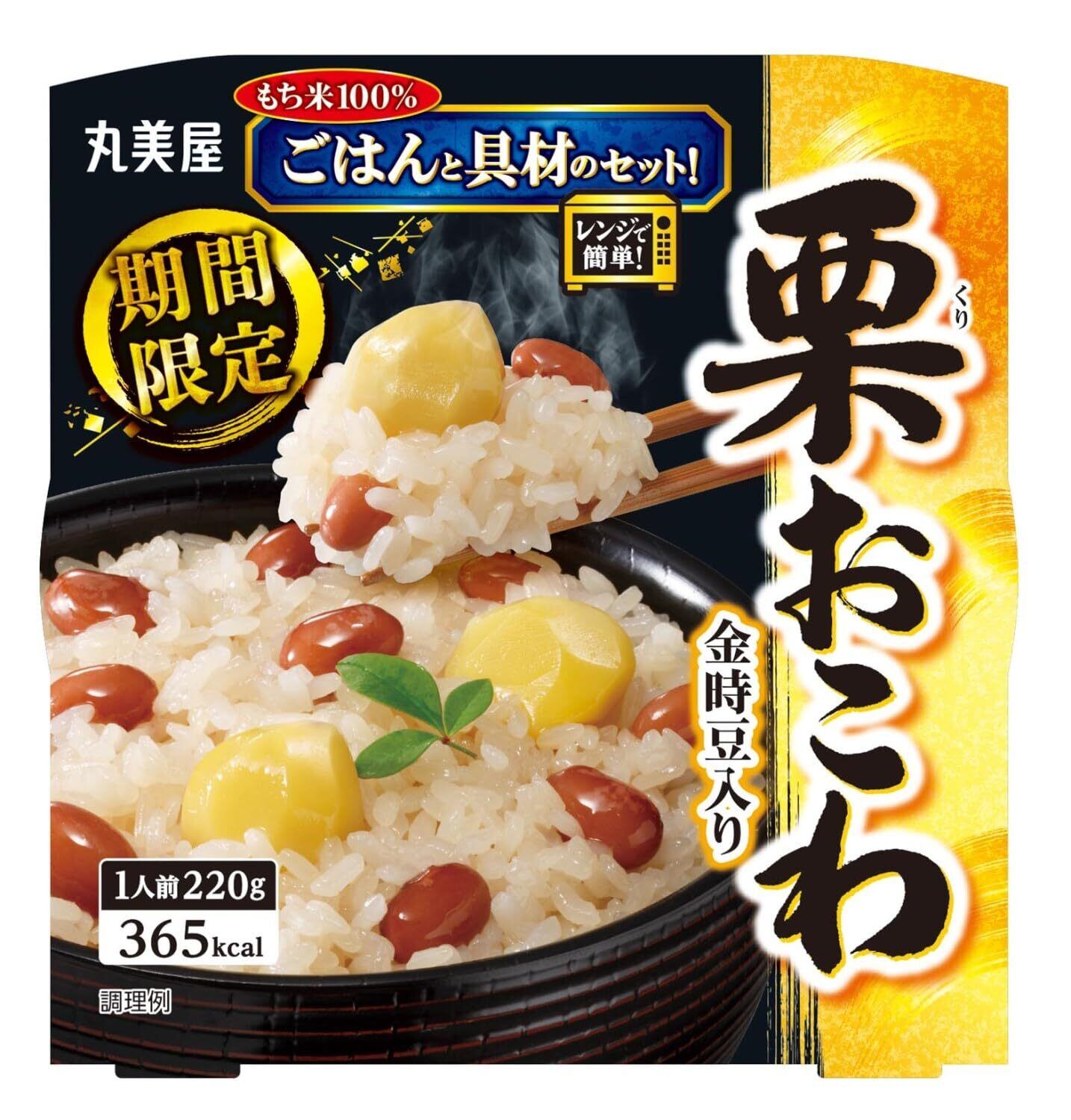原材料:[ごはん]もち米(国産)、果糖ぶどう糖液糖、発酵調味料、醤油、食塩、エキス(チキン、酵母)、鶏脂/酸味料、調味料(アミノ酸等)、(一部に小麦・大豆・鶏肉を含む)|[具材]くり、金時豆、砂糖、還元水あめ、食塩/乳酸カルシウム、増粘剤(キサンタン)、酸化防止剤(ビタミンC)