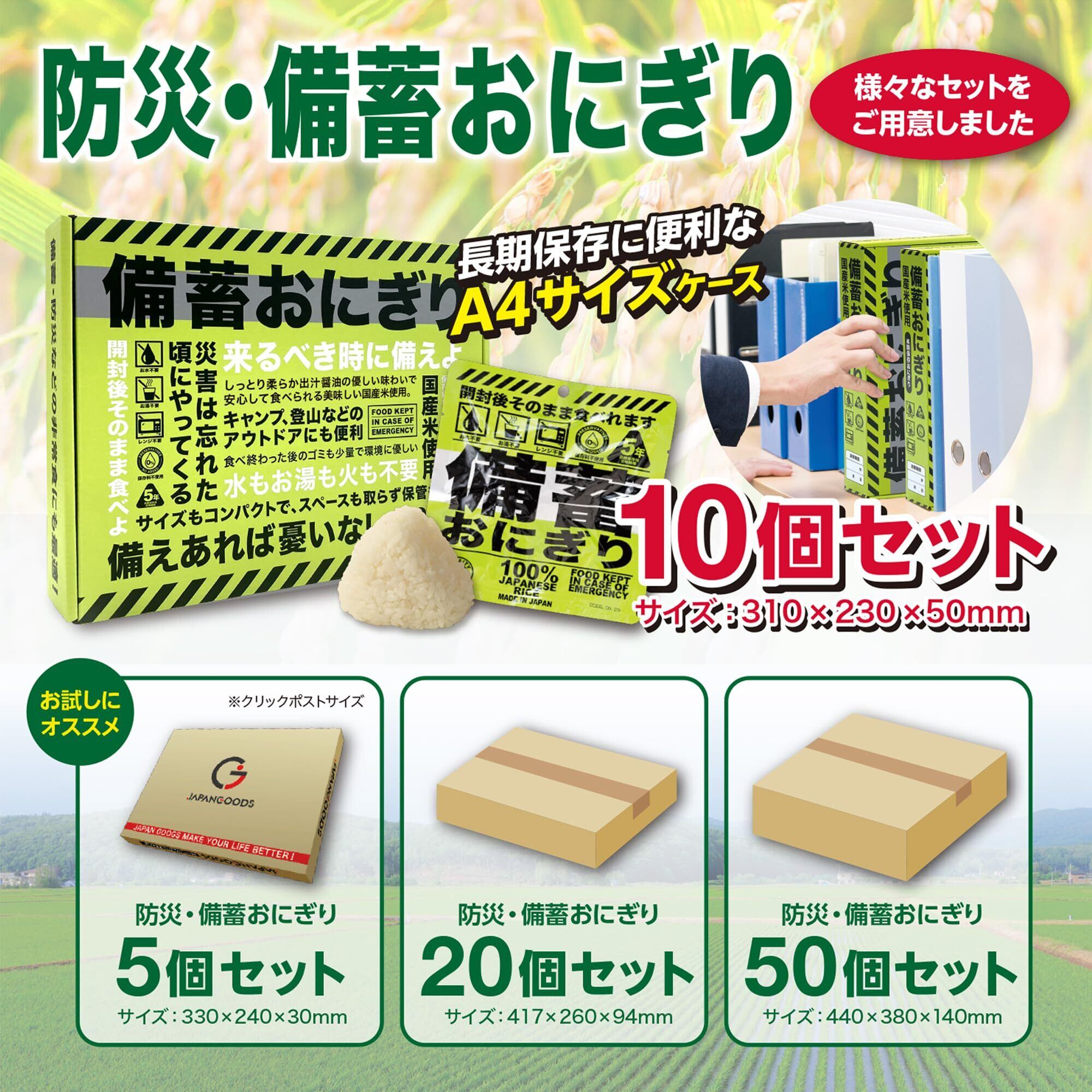 長期保存おにぎり「備蓄おにぎり」とは ・国産米100%使用 お米作りから取り組んでいます。常温保存で5年間の賞味期限を実現、長期保存が可能 ・水もお湯も火も不要で、袋から出してそのまま食べることができる。 ・備蓄スペースもコンパクトで保管に便利。 ・食べ終わったら後のゴミも少量で環境にやさしい。 ・しっとり柔らかで、幼稚園児(対象年齢3才以上)からお年寄りまで美味しく召し上がれます。 ・JFS-B適合の食品工場にて製造。・災害初期のインフラ崩壊時に威力を発揮します。