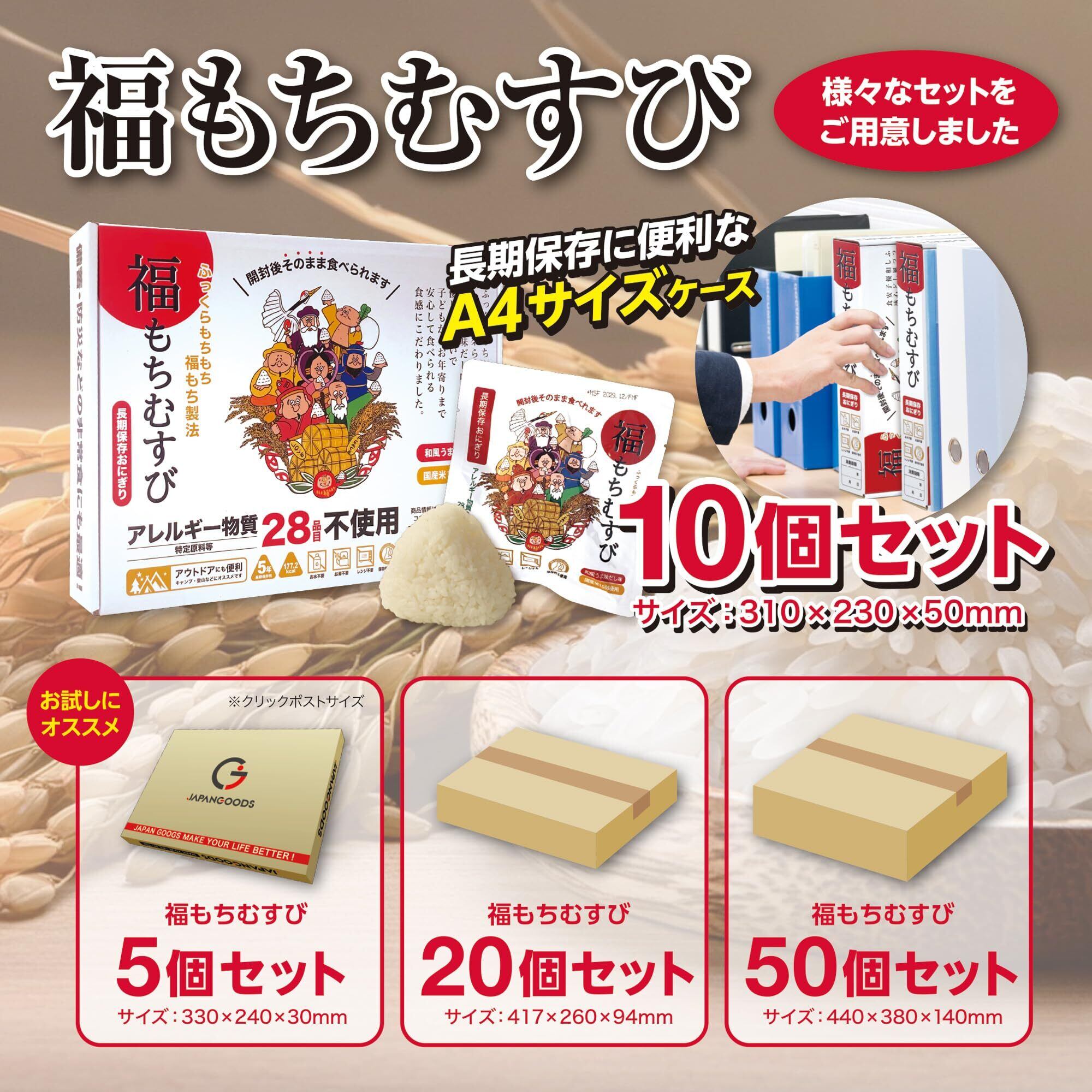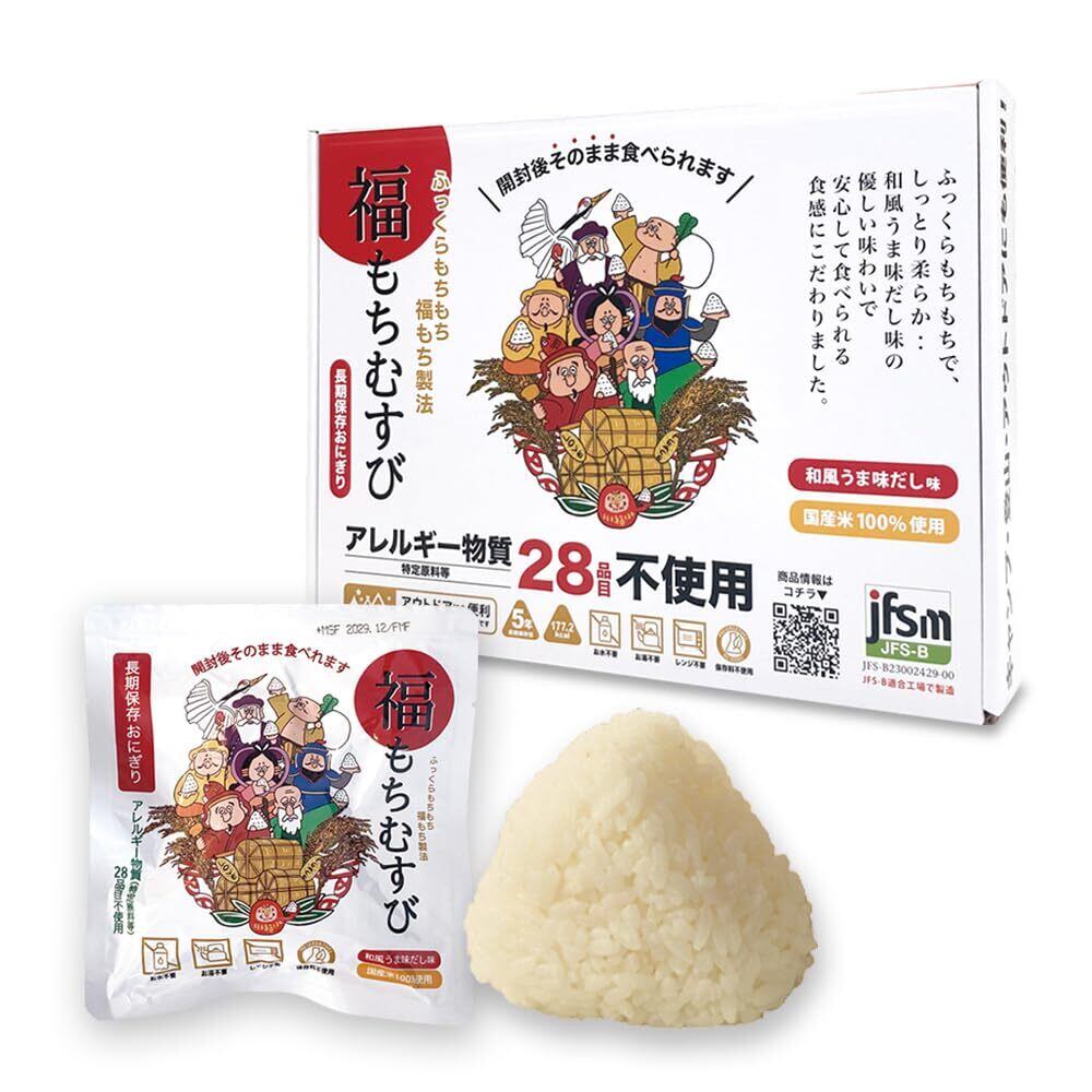 賞味期限2030年10月まで【A4ボックス10個セット】開封後そのまま食べられる 長期保存おにぎり「福もちむすび」和風うま味だし味 常温保存 国産米100%使用 アレルゲンフリー 備蓄おにぎり 非常食 保存食セット 調理不要 備蓄米 災害備蓄用に最適(家庭・学校・企業)キャンプ・登山・アウトドアにも便利 ジャパングッズ