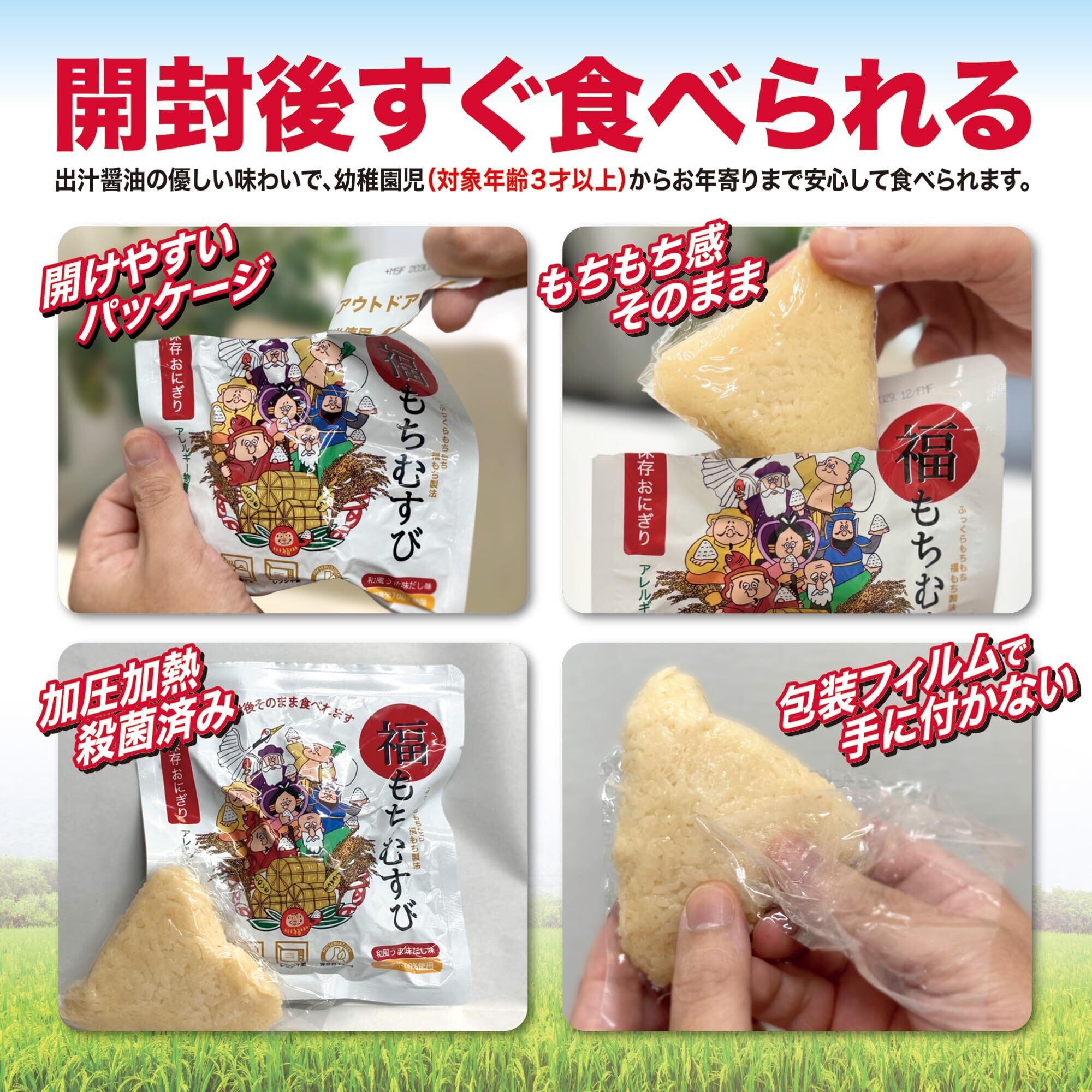 長期保存おにぎり「福もちむすび」とは ・国産米100%使用 お米作りから取り組んでいます。 ・新開発!アレルギー物質(特定原材料等)28品目不使用 ・常温保存で5年間の賞味期限を実現、長期保存が可能 ・水もお湯も火も不要で、袋から出してそのまま食べることができる。 ・備蓄スペースもコンパクトで保管に便利。 ・食べ終わったら後のゴミも少量で環境にやさしい。 ・しっとり柔らかで、幼稚園児(対象年齢3才以上)からお年寄りまで美味しく召し上がれます。 ・JFS-B適合の食品工場にて製造。 ・災害初期のインフラ崩壊時に威力を発揮します。