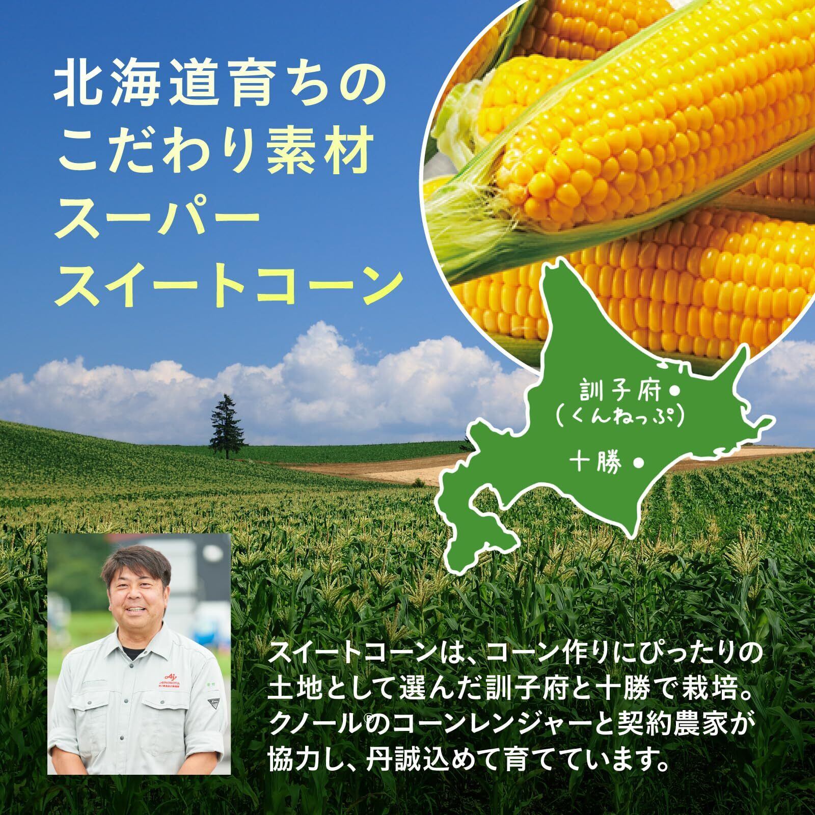 北海道産スーパースイートコーンを100%使用したとろ~り濃厚な味わいに仕上げました。