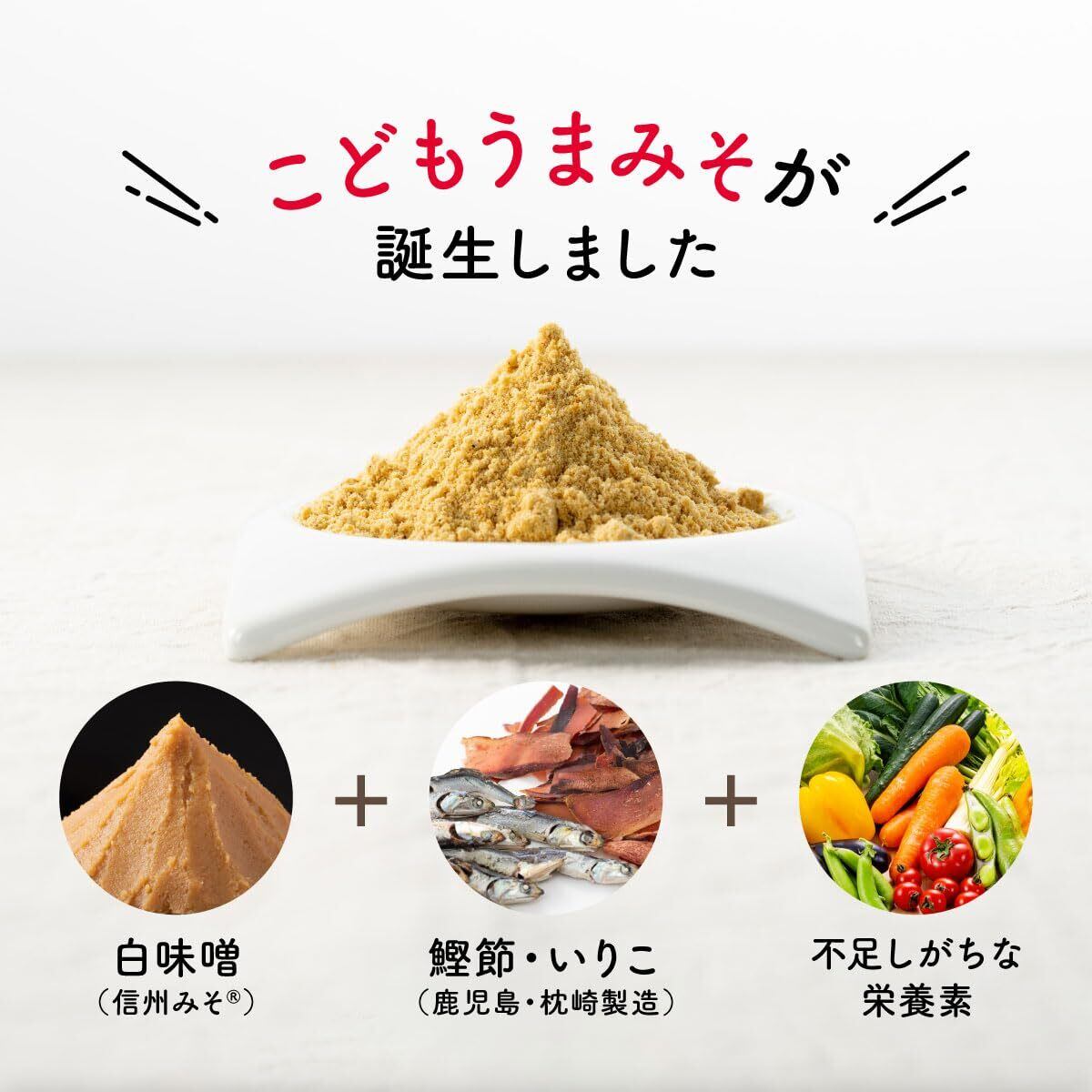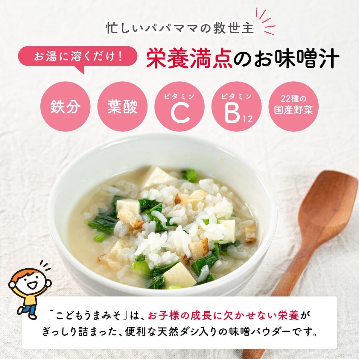【忙しいパパママの救世主】 多くの現役ママに何度もアンケートを行い、試作や試食を重ね完成した「こどもうまみそ」は、お子様の成長に欠かせない栄養がぎっしり詰まった、便利な天然だし入りの味噌パウダーです。 お湯に溶くだけで、不足しがちな鉄分・葉酸・ビタミンC・ビタミンB12・22種の国産野菜を手軽に摂取できます