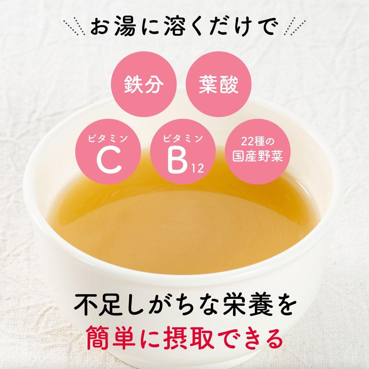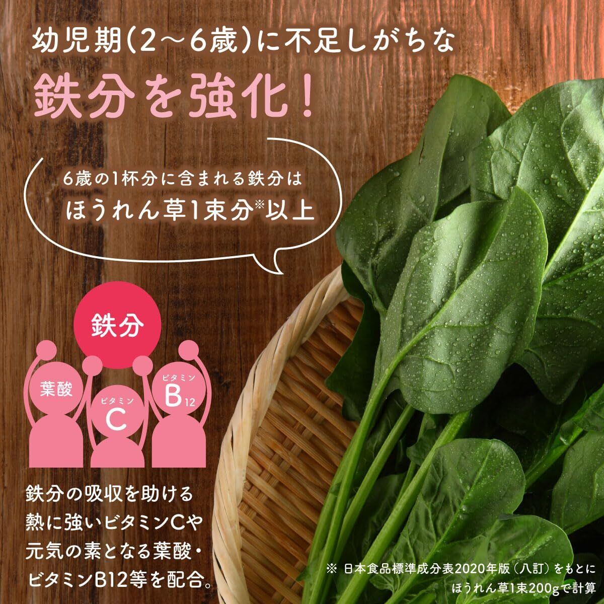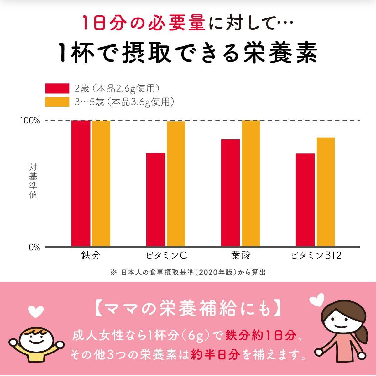 【ママの栄養補給にも】 成人女性なら1杯分(6g)で鉄分約1日分、ビタミンC・葉酸・ビタミンB12は約半日分を補うことができます。ご自身のケアもかねてぜひ親子でお使いください