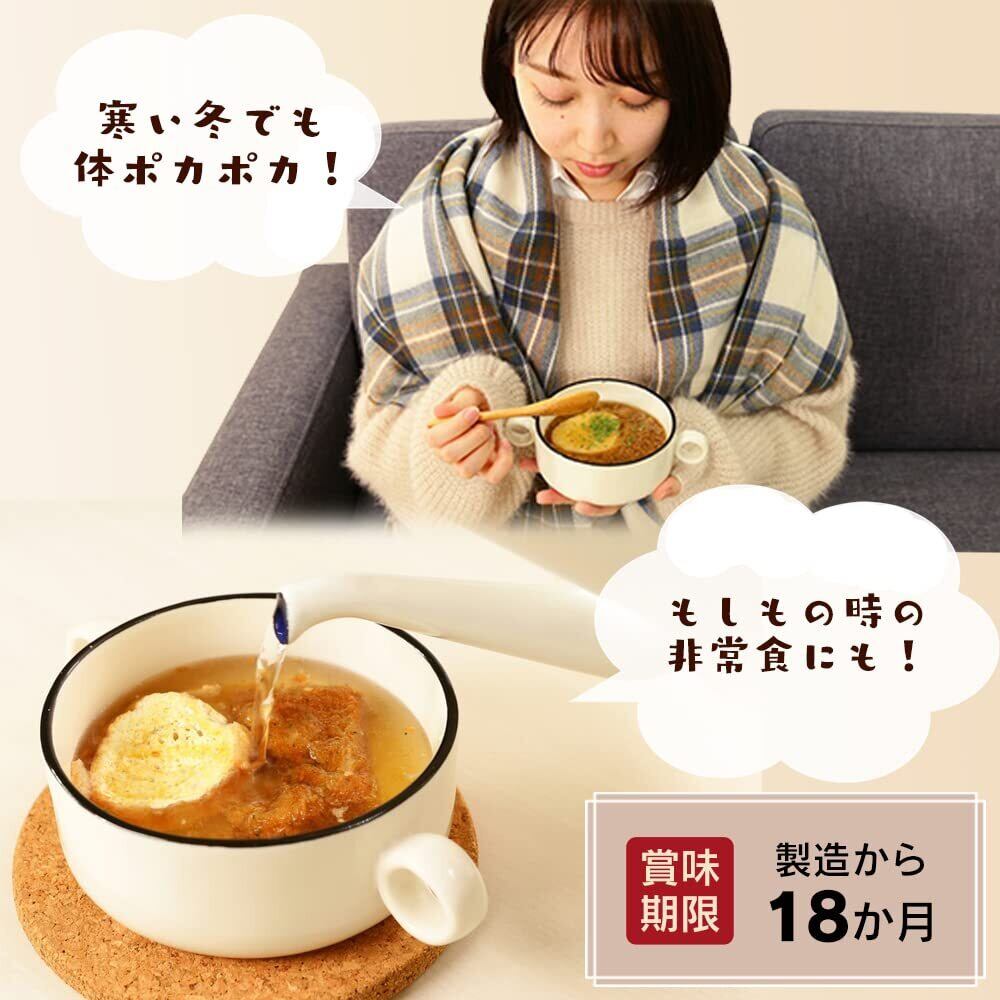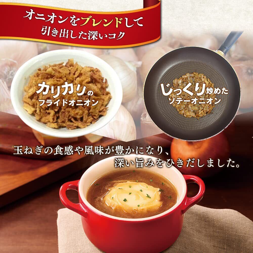 原材料名:でん粉分解物、食塩、乳糖、ソテーオニオン加工品、砂糖、ビーフコンソメパウダー、プロセスチーズ、ビーフパウダー、ガーリックパウダー、オニオンパウダー、酵母エキス、胡椒加工品、うきみ・具(フランスパン(国内製造)、フライドオニオン、ナチュラルチーズ、でん粉分解物、脱脂粉乳、パーム油、乾燥パセリ、食塩、ゼラチン、酵母エキス、胡椒加工品)/調味料(アミノ酸等)、カラメル色素、増粘剤(グァーガム)、酸化防止剤(ビタミンE)、酸味料、香辛料抽出物、香料、(一部に卵・乳成分・小麦・牛肉・大豆・鶏肉・豚肉・ゼラチンを含む)
