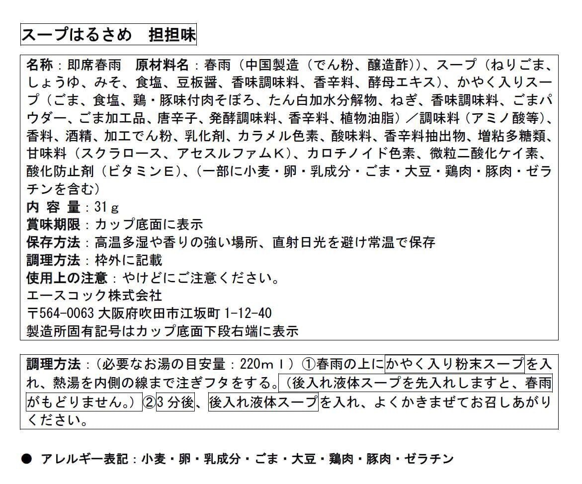 原材料名:春雨(中国製造(でん粉、醸造酢))、スープ(ねりごま、しょうゆ、みそ、食塩、豆板醤、香味調味料、香辛料、酵母エキス)、かやく入りスープ(ごま、食塩、鶏・豚味付肉そぼろ、たん白加水分解物、ねぎ、香味調味料、ごまパウダー、ごま加工品、唐辛子、発酵調味料、香辛料、植物油脂)/調味料(アミノ酸等)、香料、酒精、加工でん粉、乳化剤、カラメル色素、酸味料、香辛料抽出物、増粘多糖類、甘味料(スクラロース、アセスルファムK)、カロチノイド色素、微粒二酸化ケイ素、酸化防止剤(ビタミンE)、(一部に小麦・卵・乳成分・ごま・大豆・鶏肉・豚肉・ゼラチンを含む)