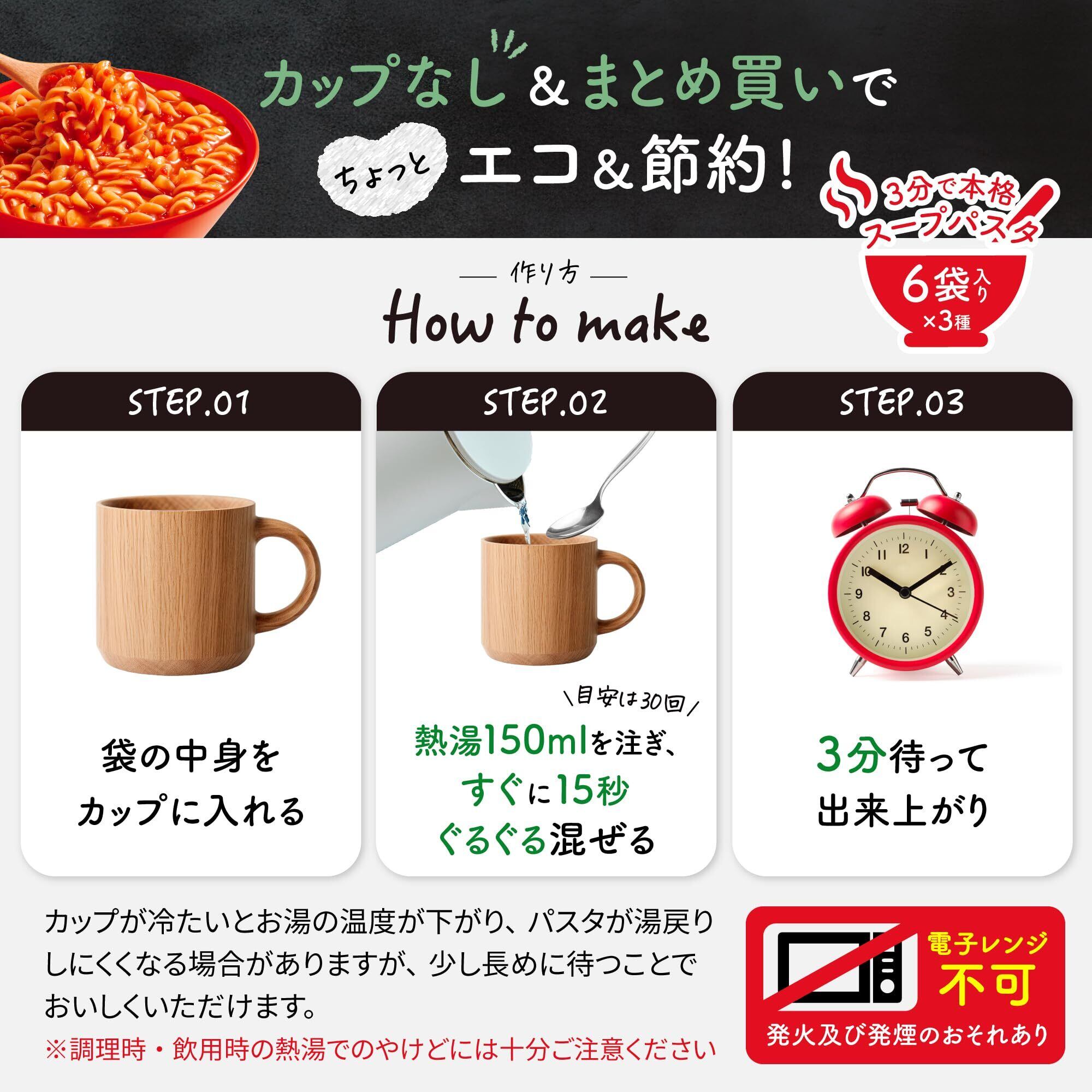 【完熟トマト】パスタ(ベルギー製造)、トマトパウダー、砂糖、マッシュポテト、デキストリン、でん粉、食塩、乾燥トマト、クリーミングパウダー、食用加工油脂、トマトエキス、香辛料、チーズパウダー、あさりエキス、たらパウダー、大豆発酵調味料、たん白加水分解物、野菜エキス調味料/調味料(アミノ酸等)、キサンタンガム、酸味料、(一部に小麦・乳成分・大豆・鶏肉を含む) 【ポルチーニ香るきのこ】パスタ(ベルギー製造)、クリーミングパウダー、でん粉、デキストリン、濃縮ホエイ、食塩、砂糖、マッシュルームエキス、ポルチーニパウダー、乾燥ぶなしめじ、チーズパウダー、マッシュポテト、食用加工油脂、バターソテーオニオンパウダー、バターソテーマッシュルームパウダー、オニオンパウダー、マッシュルームパウダー、粉末しょうゆ、酵母エキス、香辛料、パセリ/調味料(アミノ酸等)、加工デンプン、酸化防止剤(ビタミンE)、カラメル色素、酸味料、(一部に小麦・乳成分・大豆を含む) 【ほうれん草とサーモン】パスタ(ベルギー製造)、でん粉、クリーミングパウダー、デキストリン、砂糖、食塩、鮭フレーク、チーズパウダー、鮭パウダー、乾燥ほうれん草、食用加工油脂、全粉乳、オニオンパウダー、香辛料、酵母エキス、酵母エキス発酵調味料/調味料(アミノ酸等)、酸化防止剤(ビタミンE)、ベニコウジ色素、(一部に小麦・乳成分・さけ・大豆を含む)