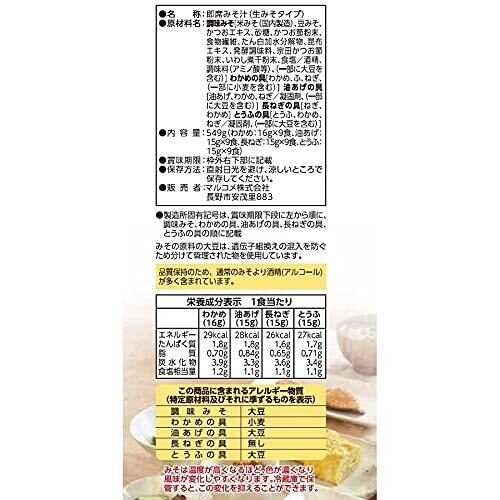 調味みそ[米みそ(国内製造)、豆みそ、かつおエキス、砂糖、かつお節粉末、食物繊維、たん白加水分解物、昆布エキス、発酵調味料、宗田かつお節粉末、いわし煮干粉末、食塩/酒精、調味料(アミノ酸等)、(一部に大豆を含む)] わかめの具[わかめ、ふ、ねぎ、(一部に小麦を含む)] 油あげの具[油あげ、わかめ、ねぎ/凝固剤、(一部に大豆を含む)] 長ねぎの具[ねぎ、わかめ] とうふの具[とうふ、わかめ、ねぎ/凝固剤、(一部に大豆を含む)]