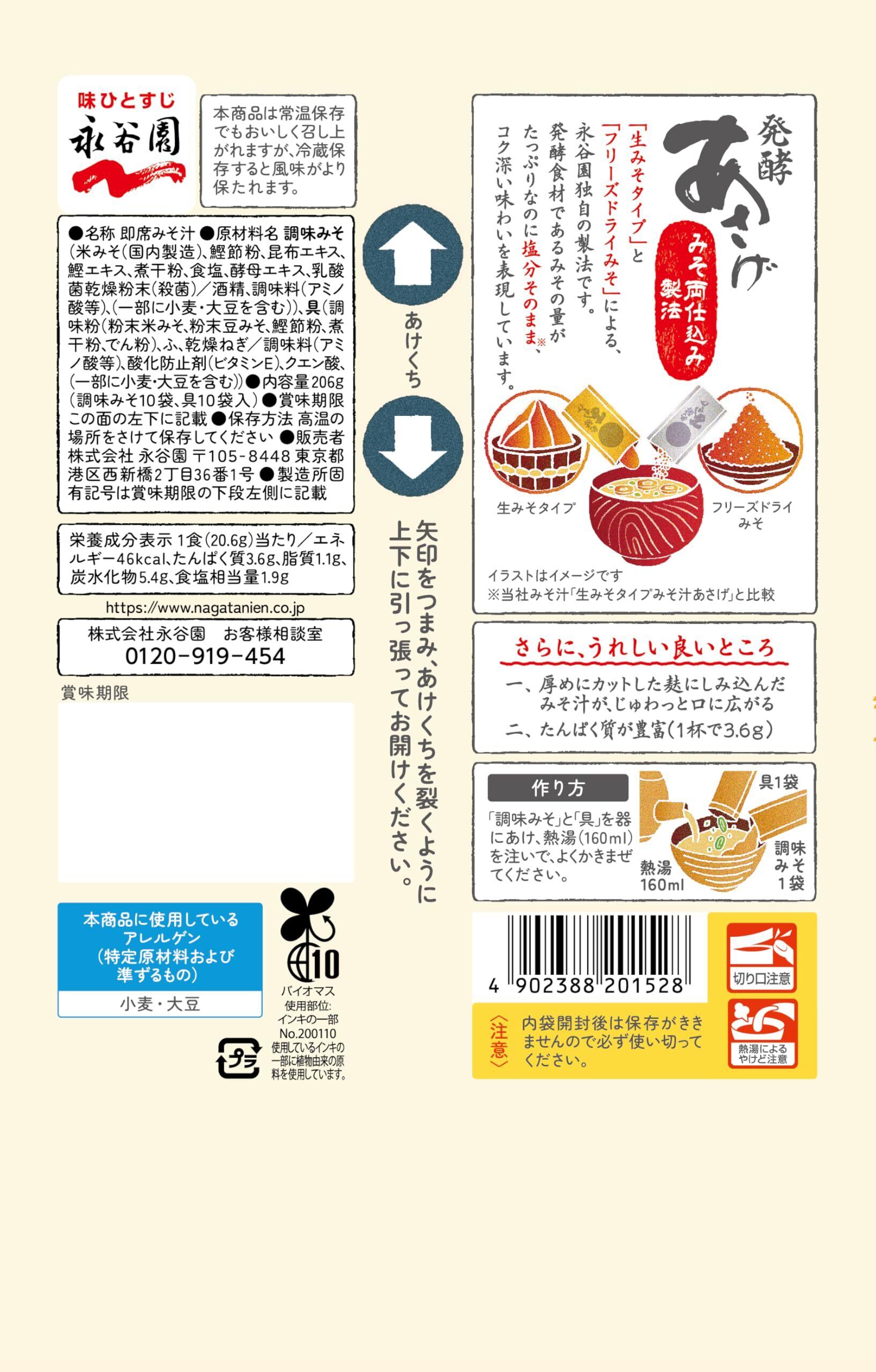 あさげの特長である汁物本来の美味しさを追求した商品「発酵あさげ」。塩分そのままで、発酵食材(みそ)が1.48倍(当社生みそタイプあさげと比較)みそのコク深い味わいをしっかりと感じられます。