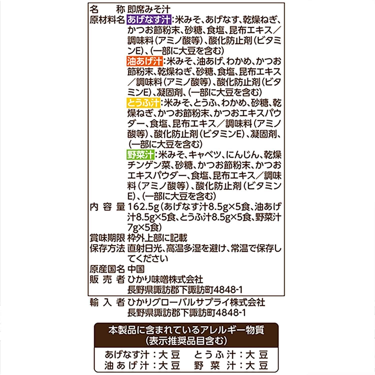 原材料:●あげなす汁 米みそ、あげなす、乾燥ねぎ、かつお節粉末、砂糖、食塩、昆布エキス/調味料(アミノ酸等)、酸化防止剤(ビタミンE)、(一部に大豆を含む) ●油あげ汁 米みそ、油あげ、わかめ、かつお節粉末、乾燥ねぎ、砂糖、食塩、昆布エキス/調味料(アミノ酸等)、酸化防止剤(ビタミンE)、凝固剤、(一部に大豆を含む) ●とうふ汁 米みそ、とうふ、わかめ、砂糖、乾燥ねぎ、かつお節粉末、かつおエキスパウダー、食塩、昆布エキス/調味料(アミノ酸等)、酸化防止剤(ビタミンE)、凝固剤、(一部に大豆を含む) ●野菜汁 米みそ、キャベツ、にんじん、乾燥チンゲン菜、砂糖、かつお節粉末、かつおエキスパウダー、食塩、昆布エキス/調味料(アミノ酸等)、酸化防止剤(ビタミンE)、(一部に大豆を含む)