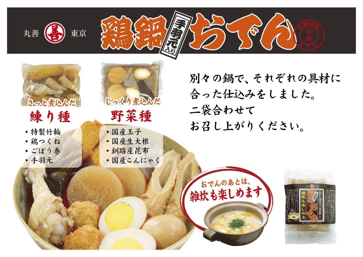 国産野菜種4種8品(玉子2個、大根2個、昆布2個、こんにゃく2個)、練り種4種7品(特製ちくわ2個、ごぼう巻2個、鶏つくね2個、手羽元1本)を別々に煮込みました。