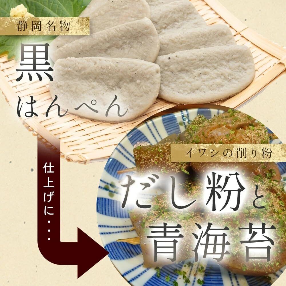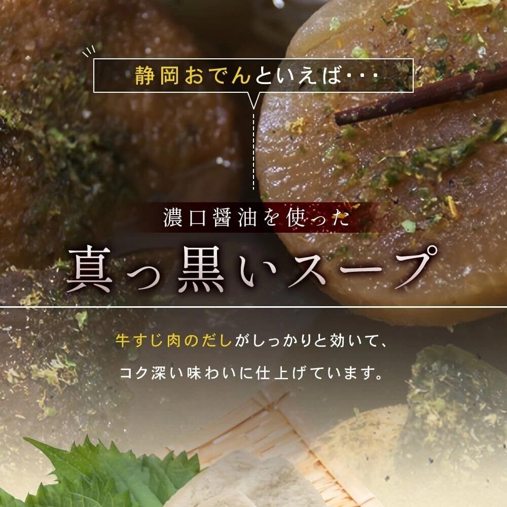 【静岡おでんと普通のおでんとの違いは何ですか?】静岡おでんには「スープが黒い」「食べるときに『だし粉(魚を粉末にした粉)』と『青海苔』をかける」という点が、一般のおでんと大きく違います。 おでんの出汁というと普通は昆布や鰹節を使い、やや黄色い透明なものが多いのですが、静岡おでんは真っ黒なスープで底が見えません。