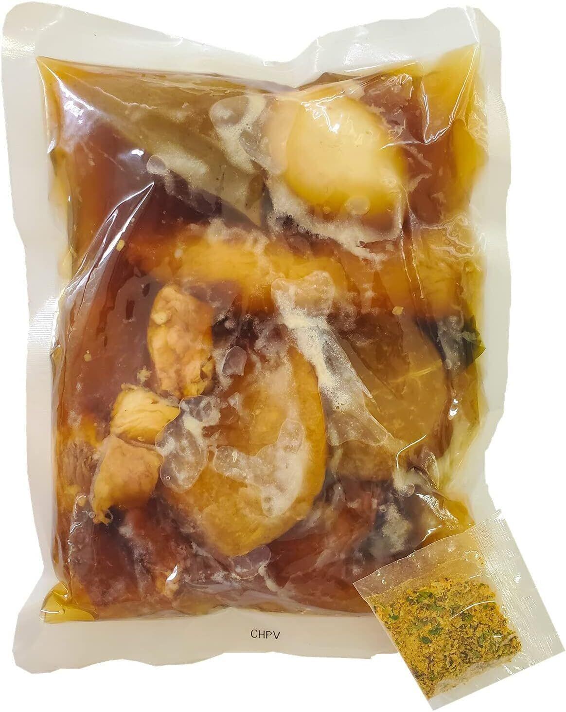 【原材料】具[魚肉ねり製品(黒はんぺん、焼きちくわ、角揚げ)、大根、たまご、こんにゃく、牛すじ肉、昆布]、おでん汁[しょうゆ、砂糖、発酵調味料、食塩、かつおぶしエキス、かつおだし、こんぶエキス、酵母エキス、酒精、カラメル色素、調味料(アミノ酸等)、ビタミンB1、]、水酸化カルシウム(こんにゃく用凝固剤)、風味かやく(いわし削り粉、アオサ)、原材料の一部に小麦、さば、大豆を含む)