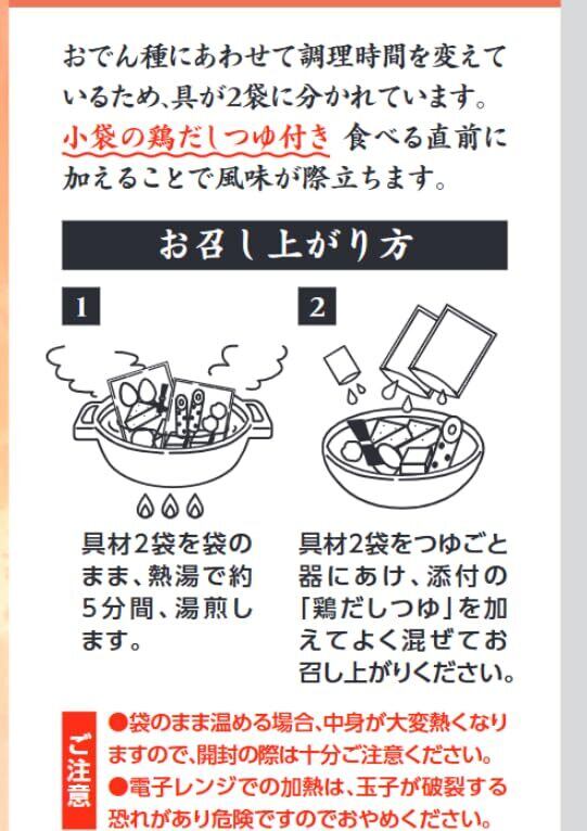 【おでん】ゆで卵(国内製造)、だいこん、鶏ごぼう入りつみれ、こんにゃく、焼きちくわ、濃縮スープ(砂糖、食塩、アミノ酸液、かつお節調味液、その他)、車麩、昆布/加工でん粉、調味料(アミノ酸等)、pH調整剤、水酸化Ca、カラメル色素、(一部に小麦・卵・乳成分・大豆・鶏肉を含む)【鶏だしつゆ】チキンブイヨン(国内製造)、チキンエキス、還元水あめ、たん白加水分解物、食塩、発酵調味液、昆布エキス、かつお節エキス、魚介エキス、酵母エキス/調味料(アミノ酸等)、V.B1,校了、(一部に鶏肉・大豆を含む)