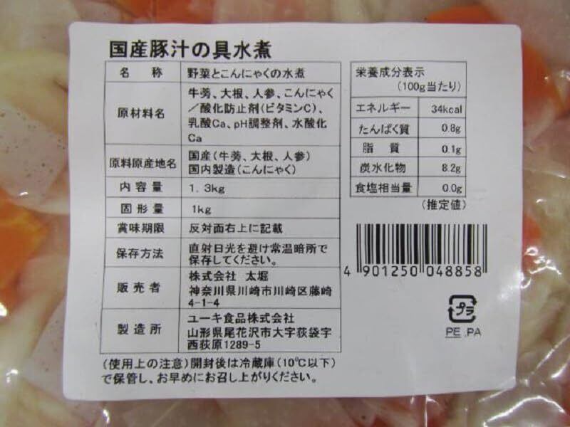 ごぼう、大根、人参、こんにゃくを水煮にしました。この商品は「pH調整剤」でpH調整をしています。調理の際には、必ず水洗いをして「pH調整剤」を洗い流してからお使いください。国産豚汁の具を半分に業務用もつ煮を1袋入れて、煮込むと、具だくさんのもつ煮を簡単に作れます。