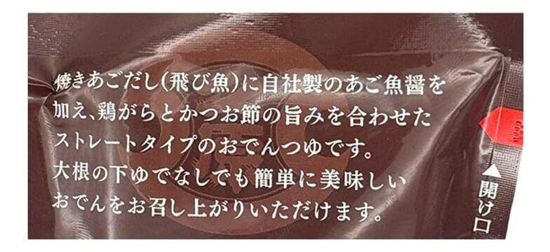 焼きあご(飛び魚)を贅沢に使用し、自社製のあご魚醤と鶏がら・かつお節の旨味を合わせた、ストレートタイプのおでんつゆです。出汁の下処理なしで、大根や卵・練り物を入れて煮込むだけで、じんわり染みる本格おでんが完成。 寒くなる秋冬にぴったり。冷えた体を芯から温める、深みある味わいをお楽しみください。〆には雑炊もおすすめ! ● 本品は「800g × 3袋セット」でお届けします ● ストレートタイプなので水で割らずにそのまま使えます ● 約2〜3人前分のレシピ付きで安心