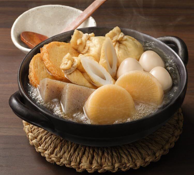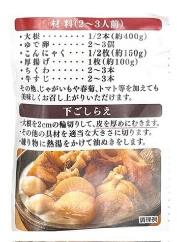 お召し上がり方(簡単3ステップ) 鍋に本品と大根を入れて沸騰 → 中〜弱火で約1時間煮込む 卵・こんにゃく・牛すじを加えてさらに30分煮込む 厚揚げ・ちくわ等を入れて5分ほど加熱すれば完成! ※〆は雑炊もおすすめ(ご飯と溶き卵を入れてどうぞ)