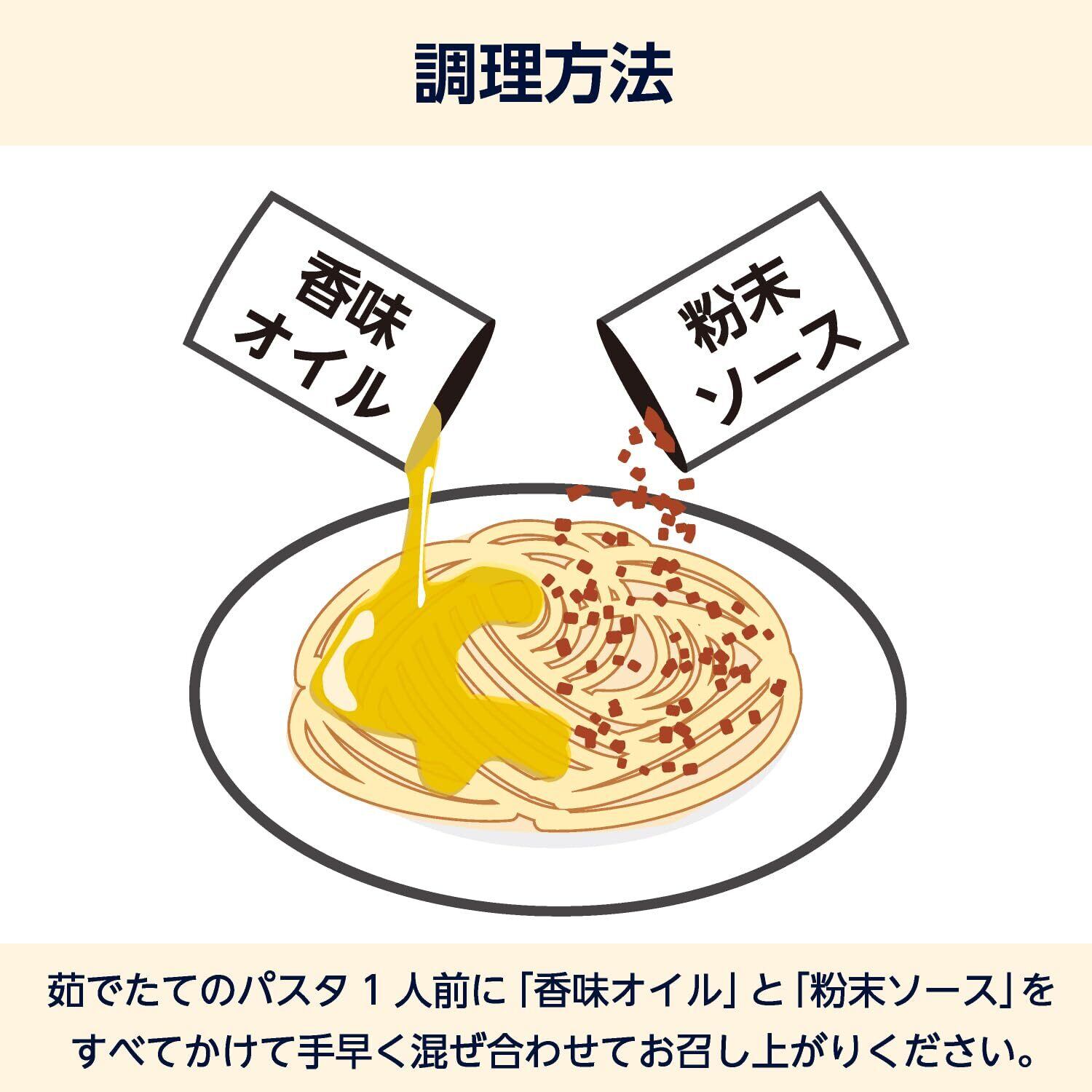 調理方法 茹でたてのパスタ1人前(乾麺で約100g)に「香味オイル」と「粉末ソース」をすべてかけて手早くよく混ぜ合わせてお召し上がりください。