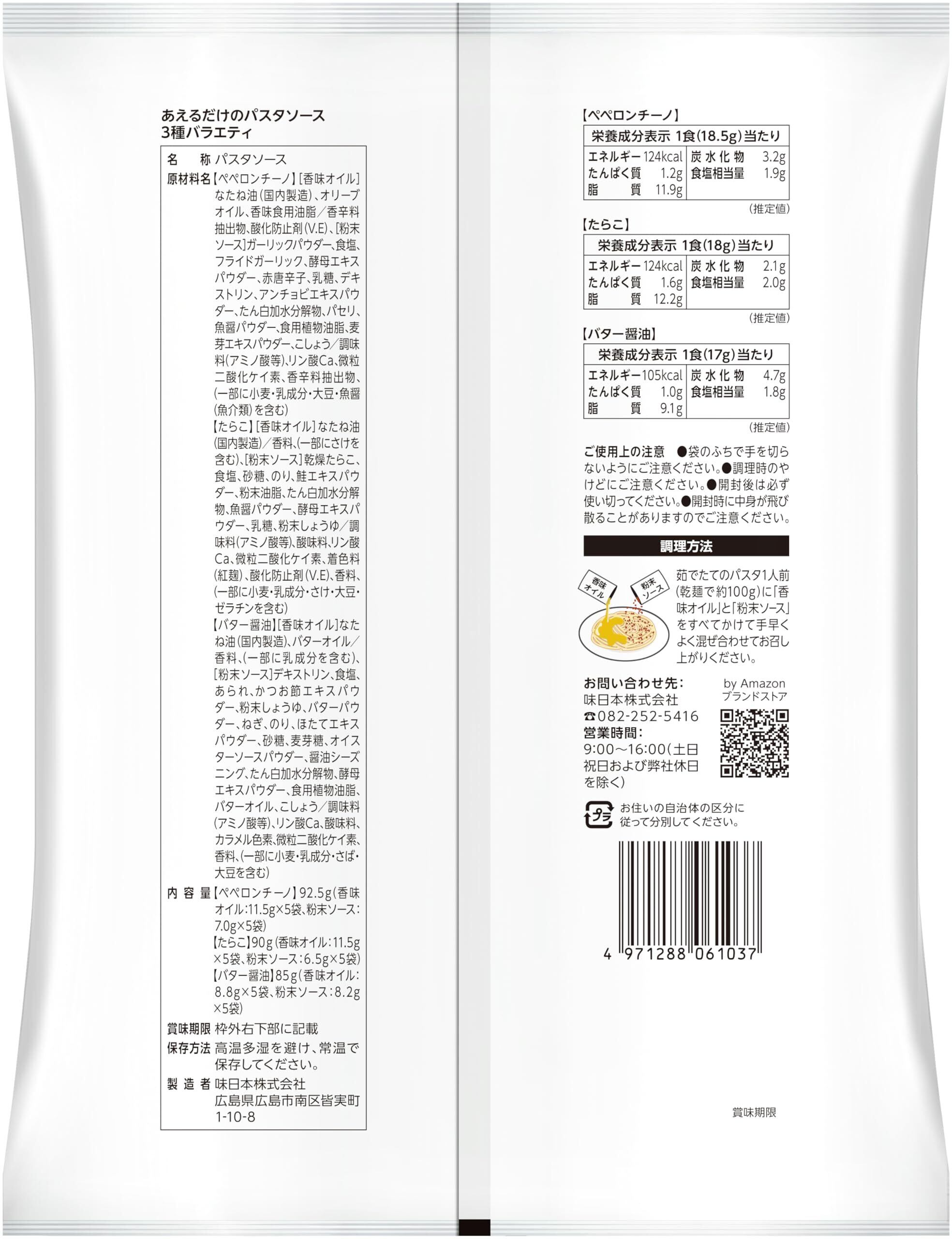 原材料・栄養成分 【ペペロンチーノ】 [香味オイル]なたね油(国内製造)、オリーブオイル、香味食用油脂/香辛料抽出物、酸化防止剤(V.E)、[粉末ソース]ガーリックパウダー、食塩、フライドガーリック、酵母エキスパウダー、赤唐辛子、乳糖、デキストリン、アンチョビエキスパウダー、たん白加水分解物、パセリ、魚醤パウダー、食用植物油脂、麦芽エキスパウダー、こしょう/調味料(アミノ酸等)、リン酸Ca、微粒二酸化ケイ素、香辛料抽出物、(一部に小麦・乳成分・大豆・魚醤(魚介類)を含む) 1食(18.5g)当たり:エネルギー 124 kcal、たんぱく質 1.2 g、脂質 11.9 g、炭水化物 3.2g、食塩相当量 1.9g 【たらこ】 [香味オイル]なたね油(国内製造)/香料、(一部にさけを含む)、[粉末ソース]乾燥たらこ、食塩、砂糖、のり、鮭エキスパウダー、粉末油脂、たん白加水分解物、魚醤パウダー、酵母エキスパウダー、乳糖、粉末しょうゆ/調味料(アミノ酸等)、酸味料、リン酸Ca、微粒二酸化ケイ素、着色料(紅麹)、酸化防止剤(V.E)、香料、(一部に小麦・乳成分・さけ・大豆・ゼラチンを含む) 1食(18g)当たり:エネルギー 124kcal、たんぱく質 1.6g、脂質 12.2g、炭水化物 2.1g、食塩相当量 2.0g 【バター醤油】 [香味オイル]なたね油(国内製造)、バターオイル/香料、(一部に乳成分を含む)、[粉末ソース]デキストリン、食塩、あられ、かつお節エキスパウダー、粉末しょうゆ、バターパウダー、ねぎ、のり、ほたてエキスパウダー、砂糖、麦芽糖、オイスターソースパウダー、醤油シーズニング、たん白加水分解物、酵母エキスパウダー、食用植物油脂、バターオイル、こしょう/調味料(アミノ酸等)、リン酸Ca、酸味料、カラメル色素、微粒二酸化ケイ素、香料、(一部に小麦・乳成分・さば・大豆を含む) 1食(17g)当たり:エネルギー 105 kcal、たんぱく質 1.0g、脂質 9.1g、炭水化物 4.7g、食塩相当量 1.8g
