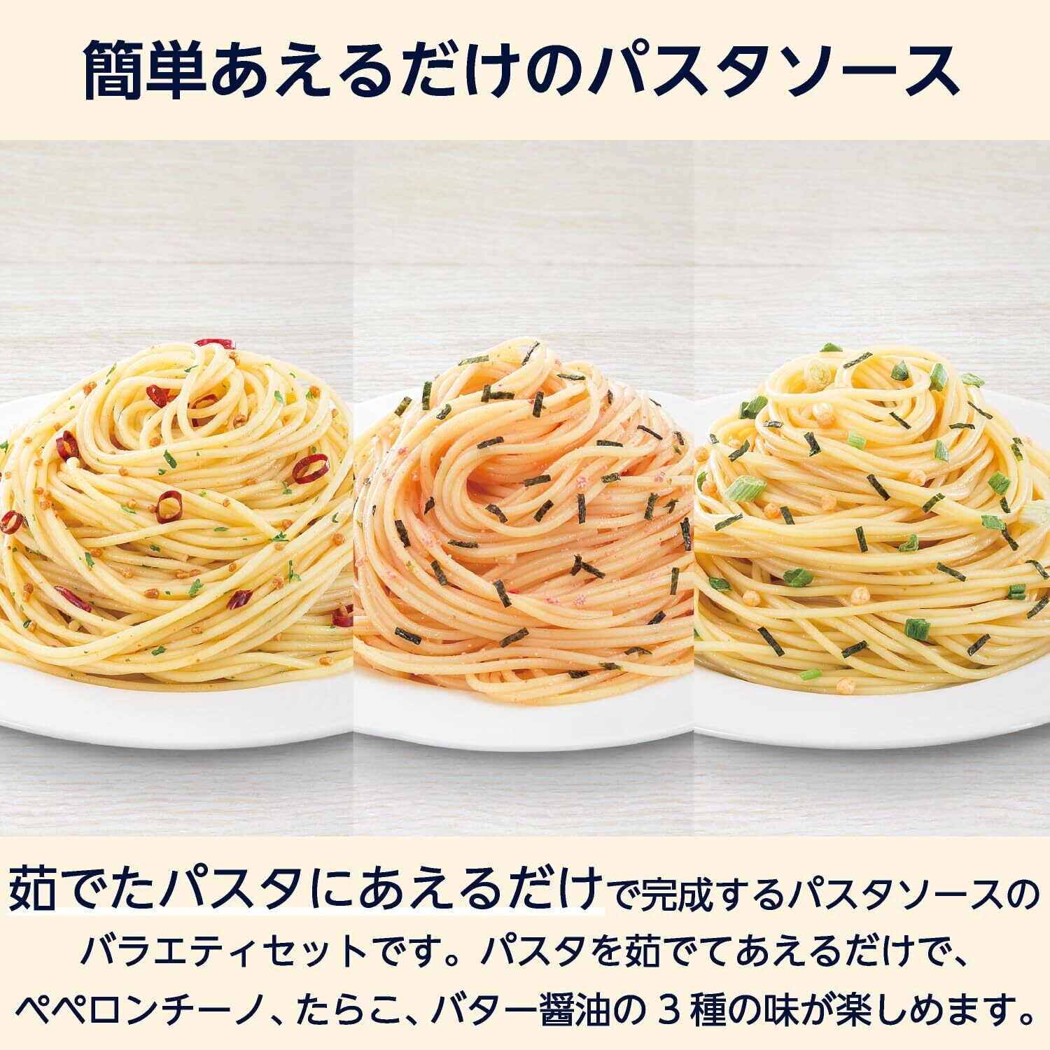 ペペロンチーノ、たらこ、バター醤油の3種類のパスタソースバラエティセット