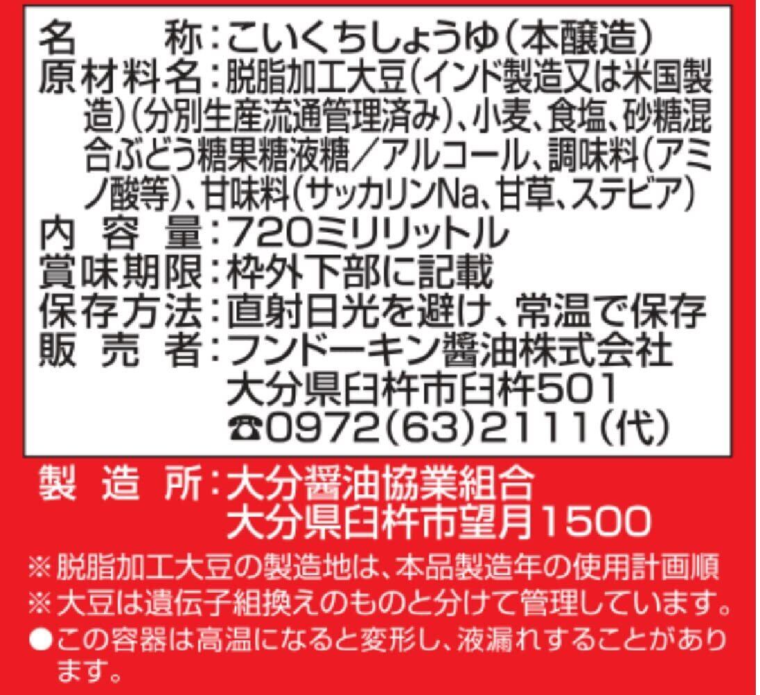 原材料:脱脂加工大豆(遺伝子組換えでない)、小麦、食塩、砂糖混合ぶどう糖果糖液糖、アルコール、調味料(アミノ酸等)、甘味料(サッカリンNa、甘草、ステビア)